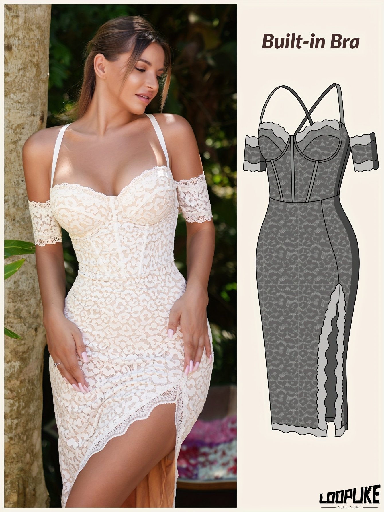 586 Romantic & Elegant Leopard Lace Midi Built-In-Bra Dress With Crisscross Back -Perfect For Party