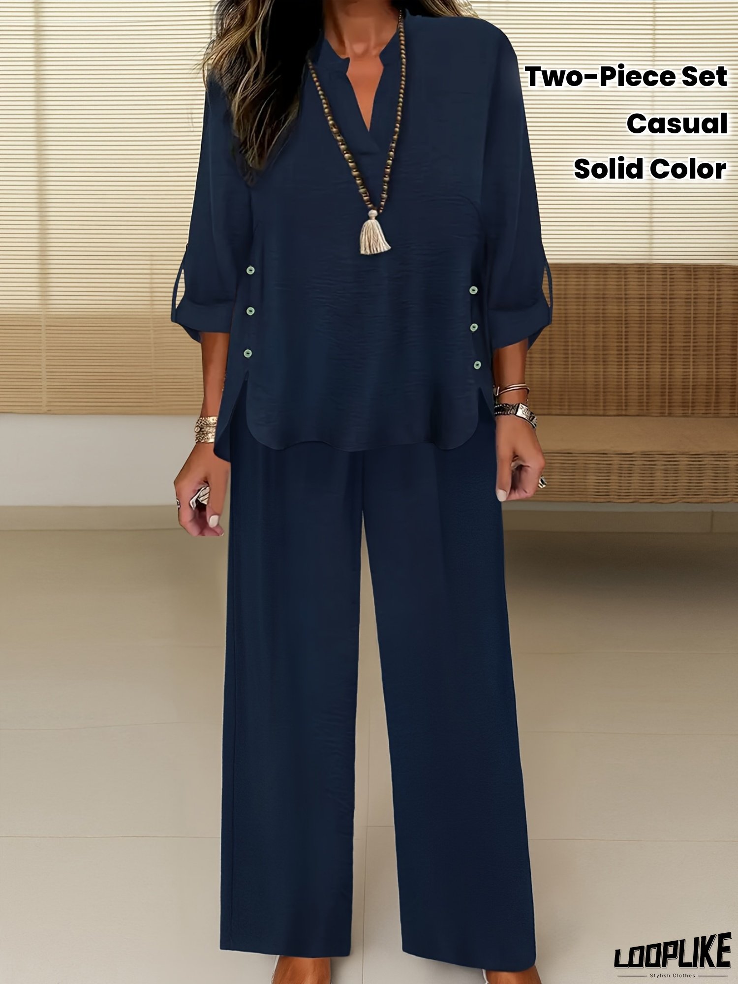 Autumn New Daily Commute V-Neck Cardigan Solid Color Top And Loose Casual Wide Leg Pants Two-Piece Set For Women