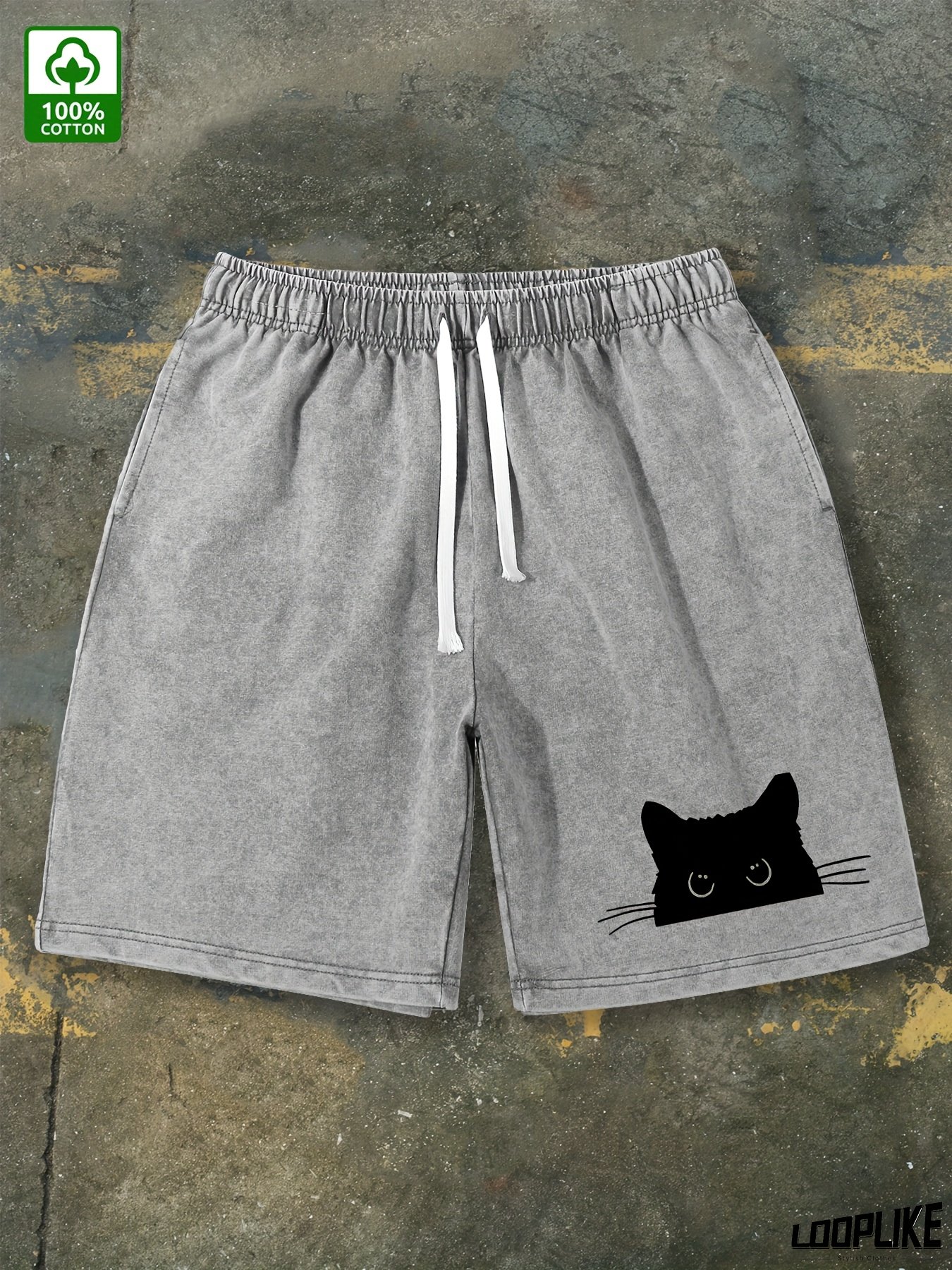 Cat Printing Summer Men'S Pleated Shorts, American Street Retro Trend Men'S Washed Shorts, Outdoor Leisure Trend Fashionable Men'S Wear, Old Batik Craft Washed Cotton Short.