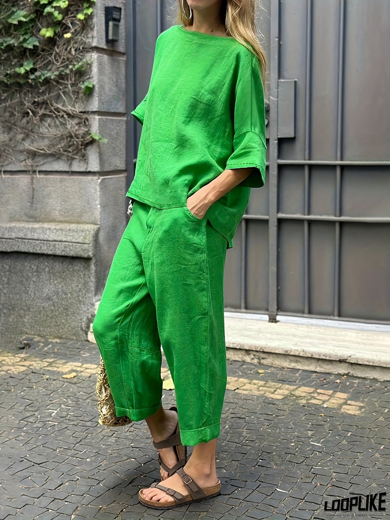 DP042618 Women's Casual Solid Color Round Neck Top and Double Pocket Pants Two-Piece Set for Summer