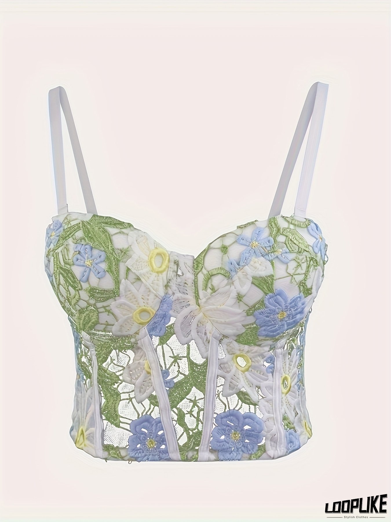 Elegant Floral Embroidered Corset Top - Mint Green & White Floral Pattern, Lace-Up Backless Design, Soft Fishbone Bustier For Women, Summer Sleeveless Cami Blouse, Floral Embroidery Top