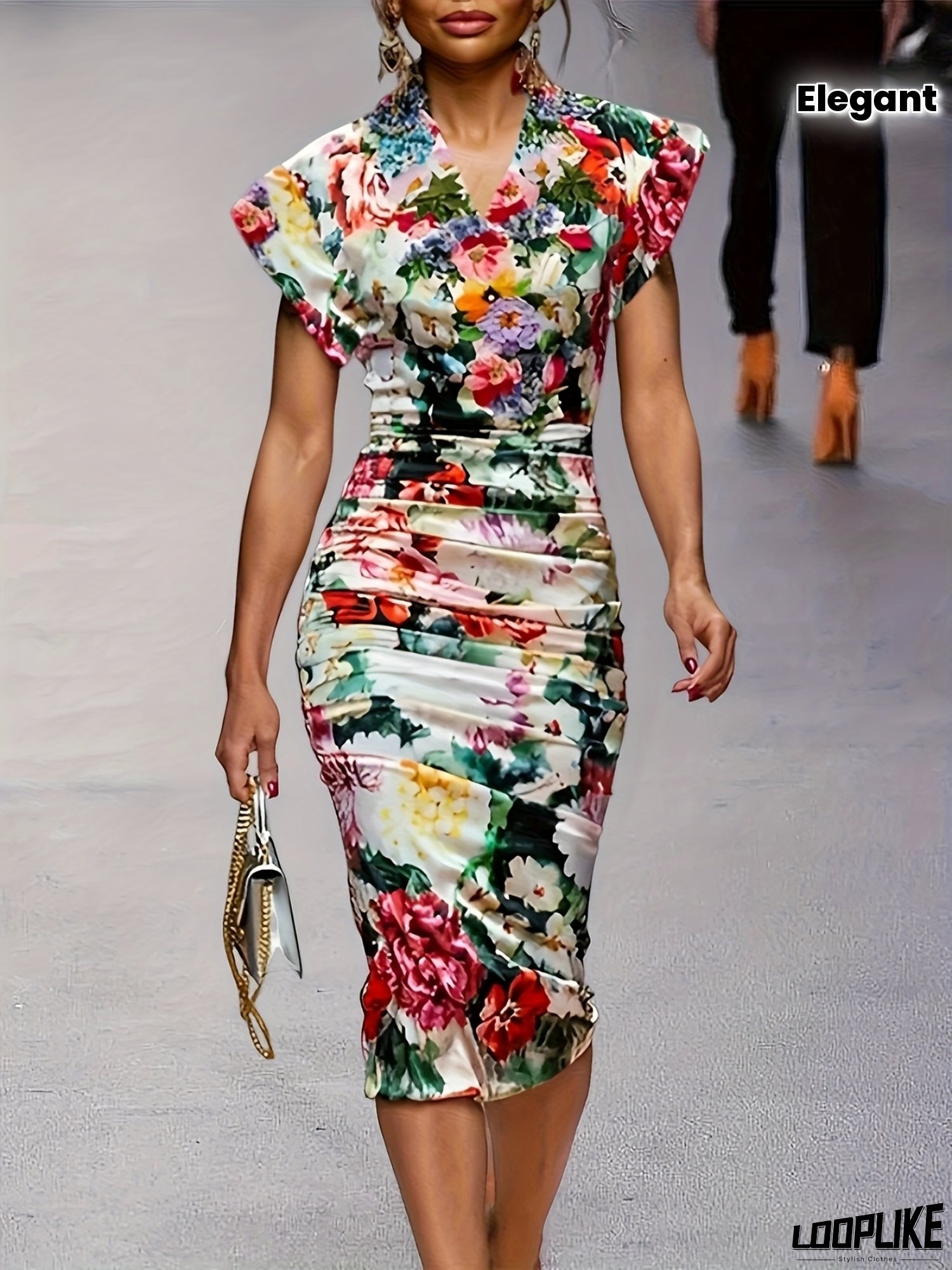 Elegant Floral V-Neck Midi Dress For Women - Bodycon With Ruffled Hem, Short Sleeves, And Cinched Waist, Perfect For Spring/Summer/Fall, Floral Dress