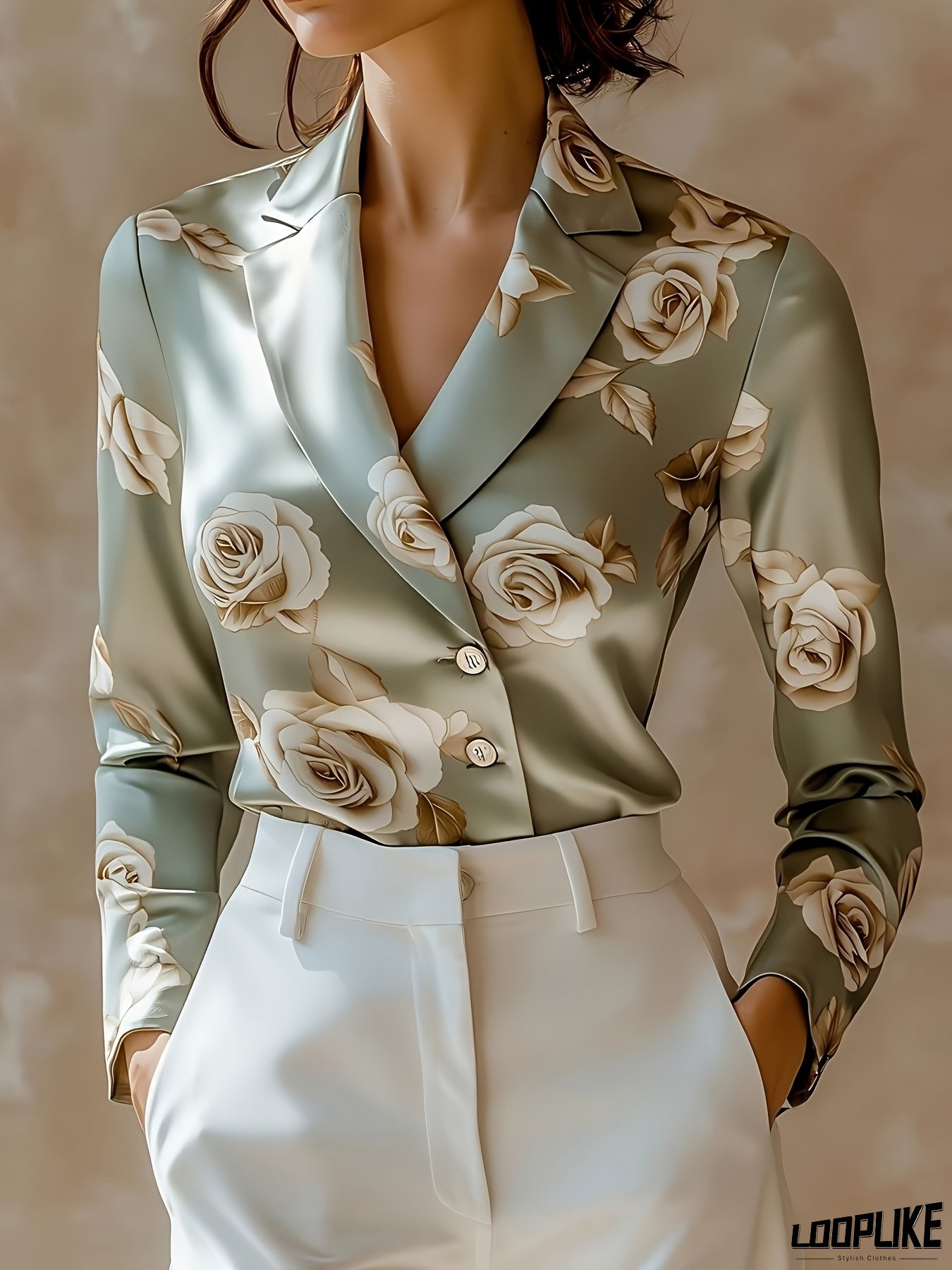 Elegant Rose Floral Print Satin Blouse - Classic Collar & Side-Button Closure, Machine Washable Non-Stretch Shirt for Women, All-Season Versatile Top for Casual & Formal Wear