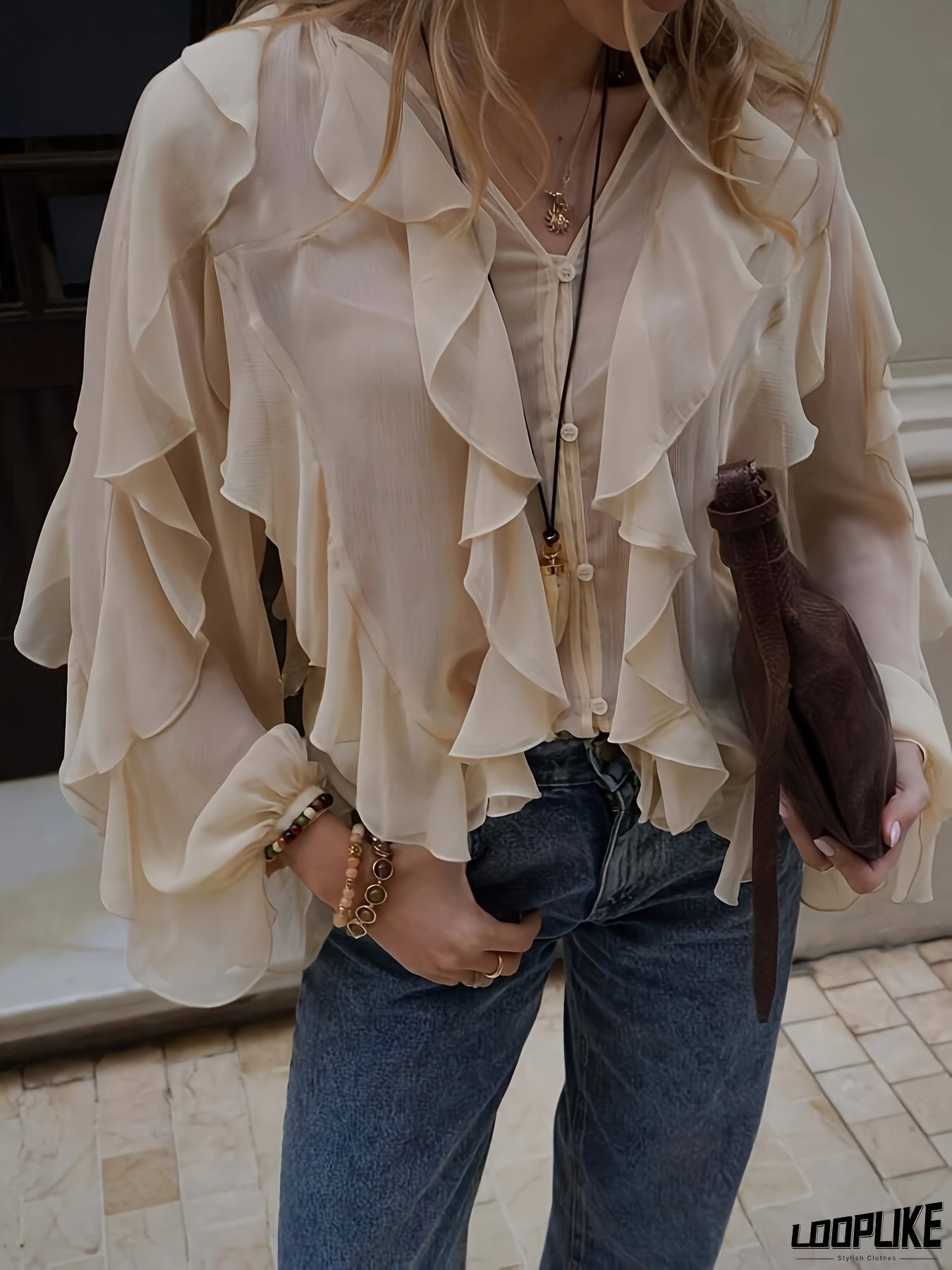 Elegant Special Women'S Blouse with Tiered Ruffle Trim and Appliqué - V-Neck, Long Sleeve, Button-Up Shirt in Beige, Perfect for Spring and Fall, Ladies Blouses