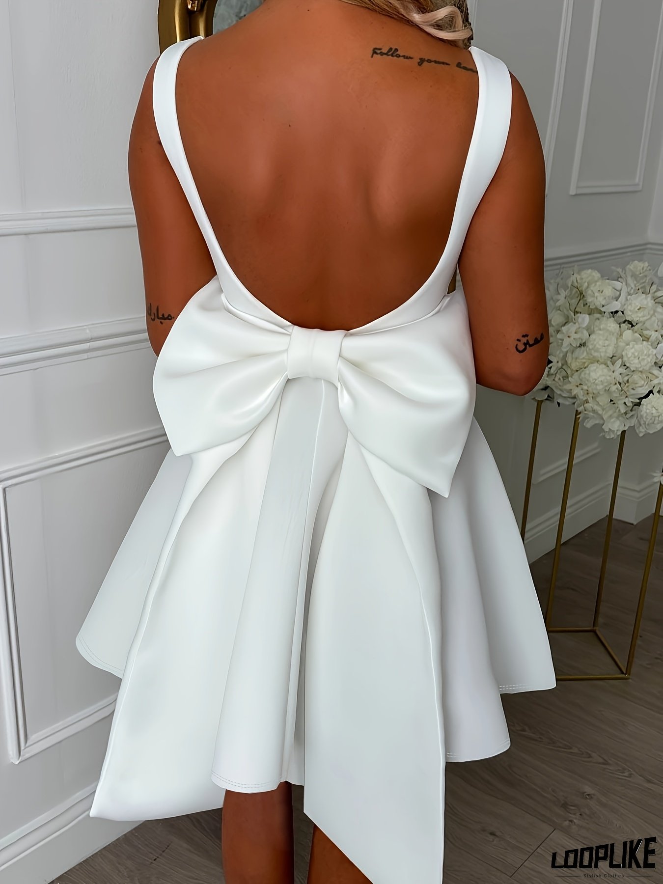 Elegant Square Neck Sleeveless Mini Dress with Large Back Bow Detail - Chic A-Line Cut, Solid Color, Perfect for Weddings & Parties, Spring/Autumn Collection, Cute Dress