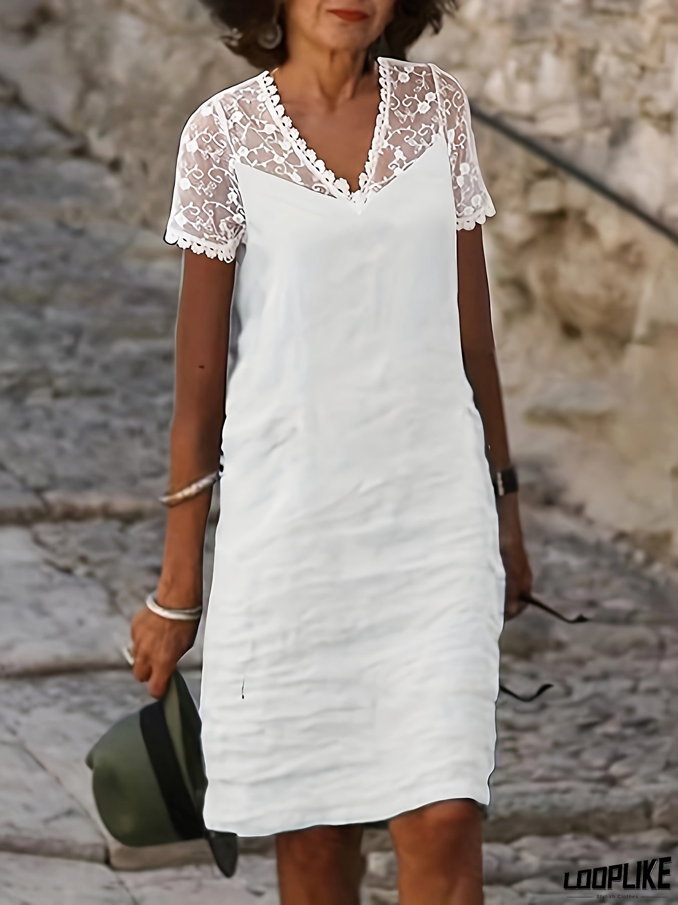 Elegant White Lace Trim V-Neck Midi Dress For Women - Short Sleeve, Loose Fit, Summer Casual Style, Perfect For Adult, Casual Summer Dress | Lace Trim Detail | Nontransparent Material