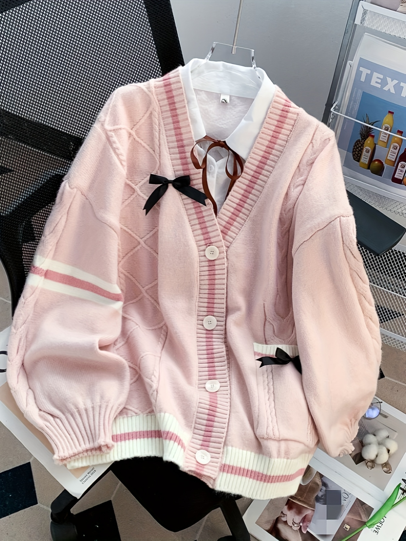 European and American Autumn-Winter New Twisted Pattern Color-Block Bow Tie Open Cardigan Jacket