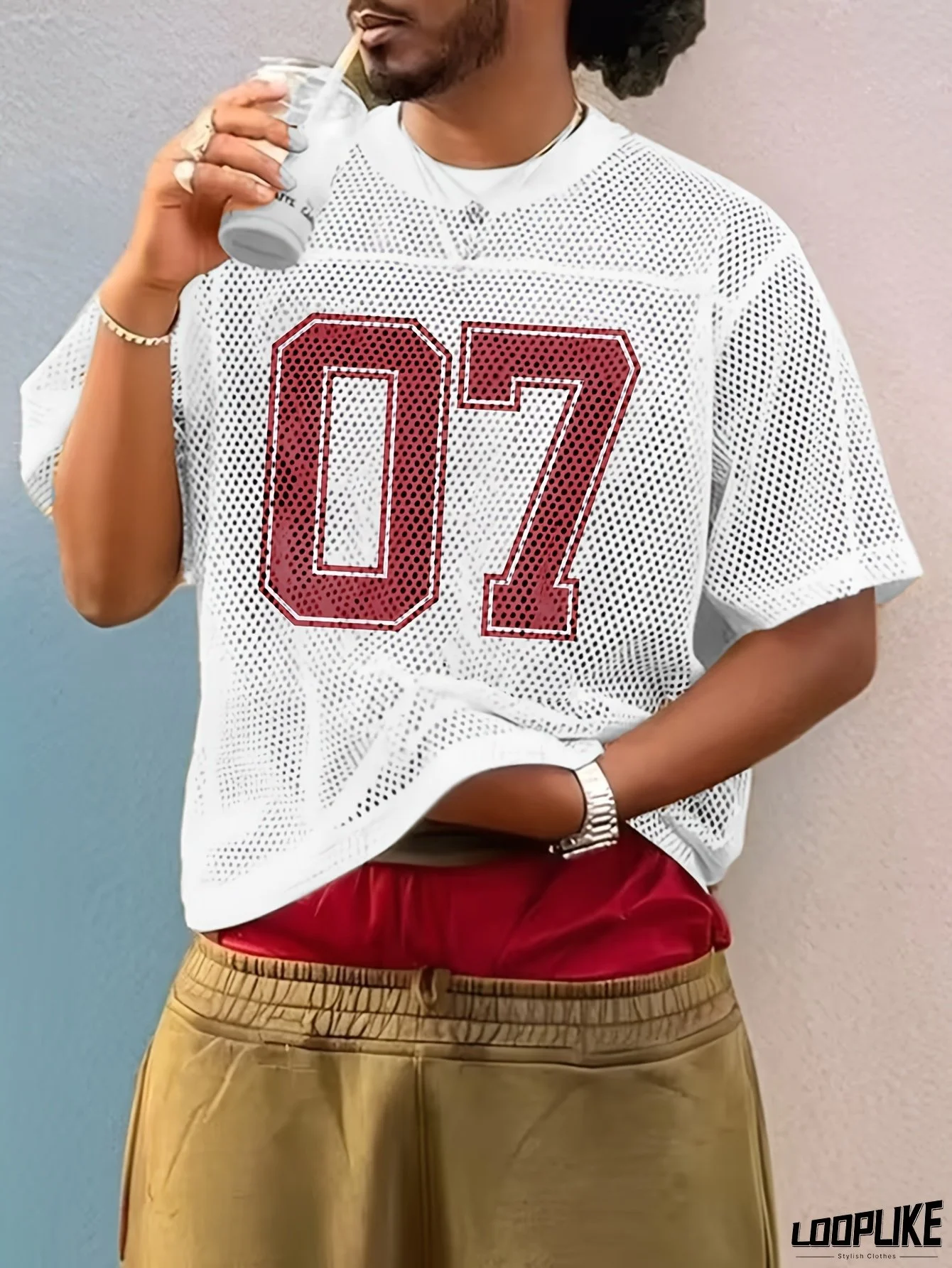 Men'S Oversized T-Shirt - Loose Fit Drop Shoulder Tee with Number 07 Graphic, Breathable Mesh Shirt for Everyday & Formal Outfits - All-Season Casual Top in White/Red Colorblock - Easy-Care Everyday Essential, Versatile Clothing, Trendy Design, Lightweight Material, Short Sleeve Shirt, Streetwear Lovers, Outfit, Streetwear Fashion, Durable Construction, Print Tee, Young Adults