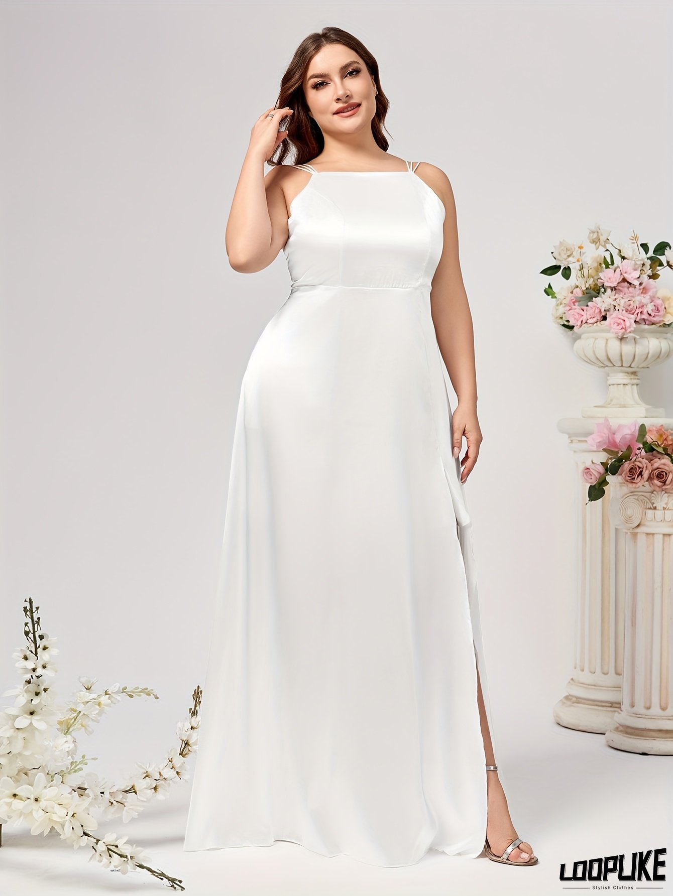 Plus Size, Plus-Size Elegant Off-Shoulder Sleeveless Party Dress with High Slit - Machine Washable Satin Evening Gown for Weddings, Galas & Formal Events, Dresses for Wedding, Wedding Guest Attire, Sophisticated Silhouette, Comfortable Fit