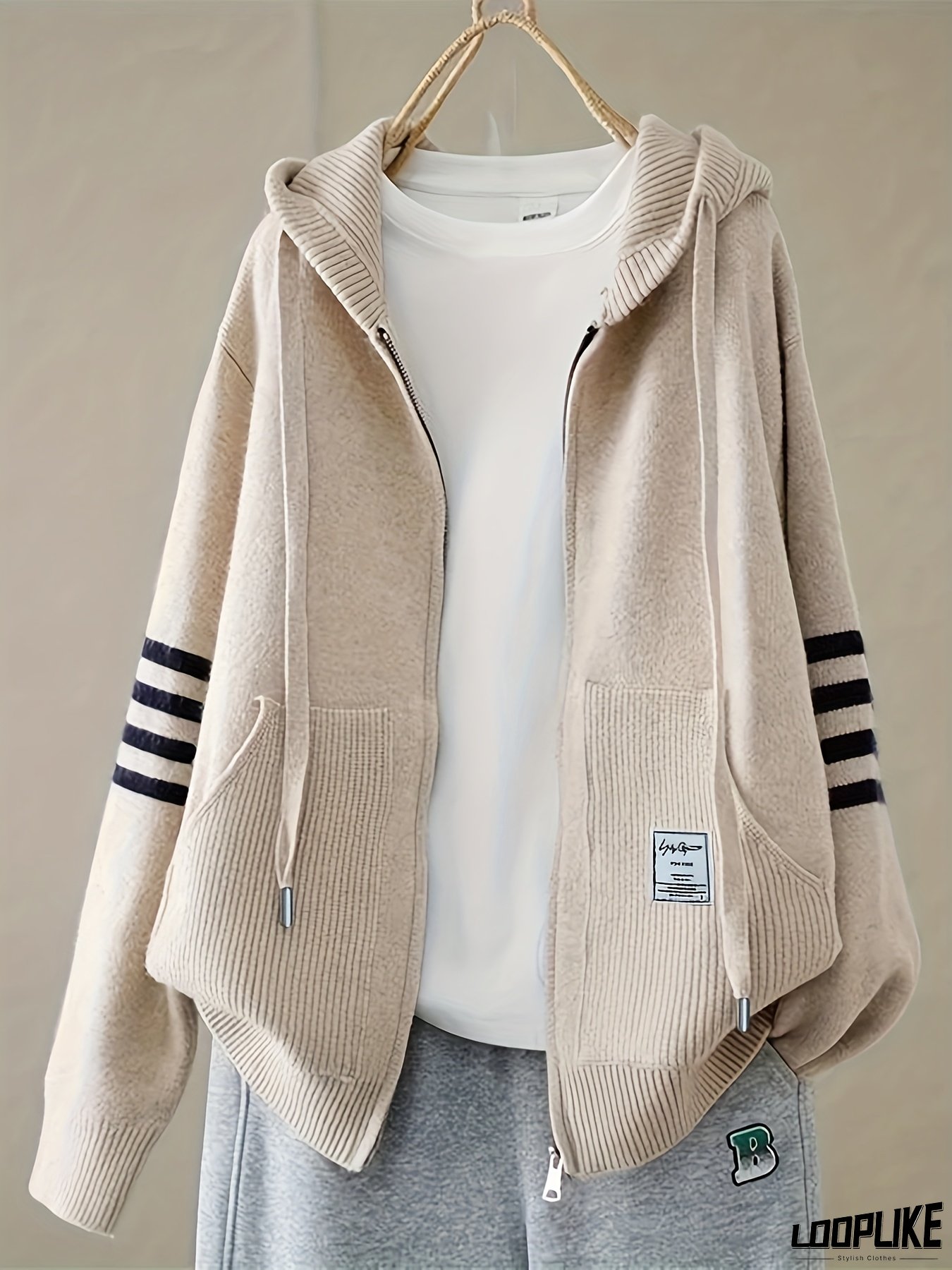 [Plus Size Hoodie] Cozy Plus Size Zip-Up Hoodie Sweater | Beige with Black Stripes, Fall & Winter Wear, Casual Style, Comfortable Clothing