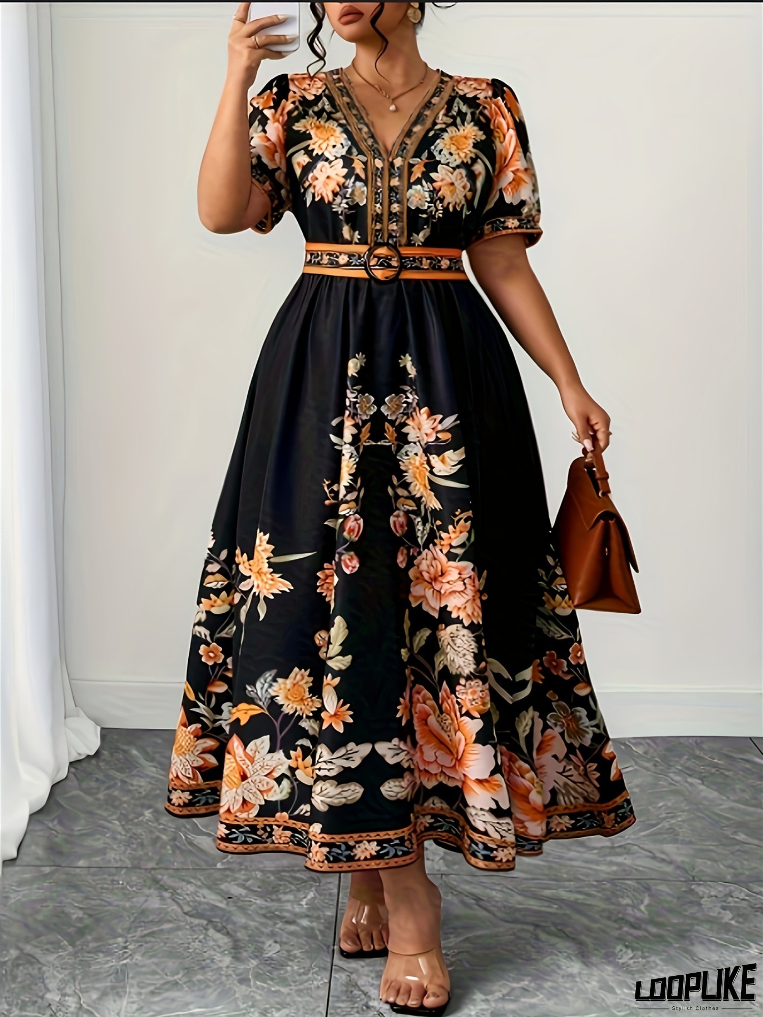 [Summer Floral Dress] Plus Size Floral Print V-Neck Maxi Dress | Polyester Fabric, Short Sleeves, Belted Waist, Black With Orange, White, And Beige Flowers - Perfect For Summer Vacations