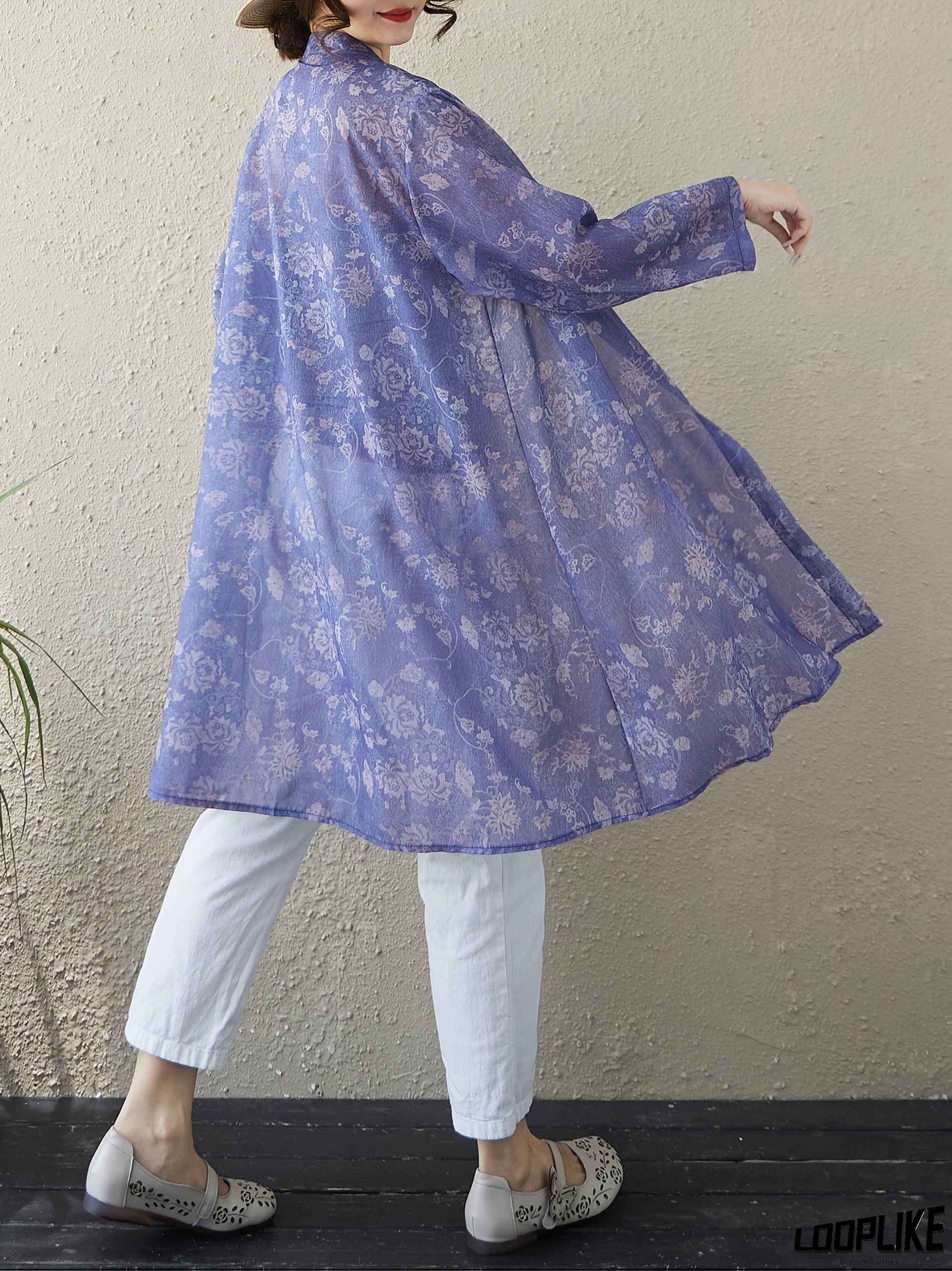 [Plus Size Bohemian Cardigan] Plus Size Women's Lightweight Bohemian Floral Print Open Front Cardigan | Stand Collar Mid-Length Loose Fit Vacation Shirt for Spring/Summer | White Pants & Crochet Shoes, Casual Outfit, Vacation Clothing, Floral Print Design, Crochet Detailing