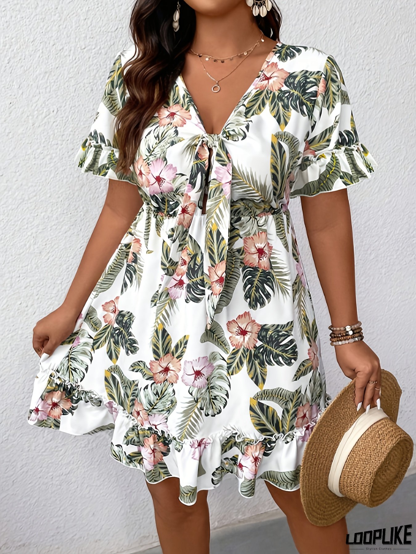 [Tropical Floral Dress] Plus Size Tropical Floral Print Dress | Women's Tie-Front V-Neck, Short Sleeves, Ruffled Hem - Elegant Summer Beachwear in White with Pink, Green, and Blue Flowers, Casual Wear | Vneck Dress | Glossy Texture