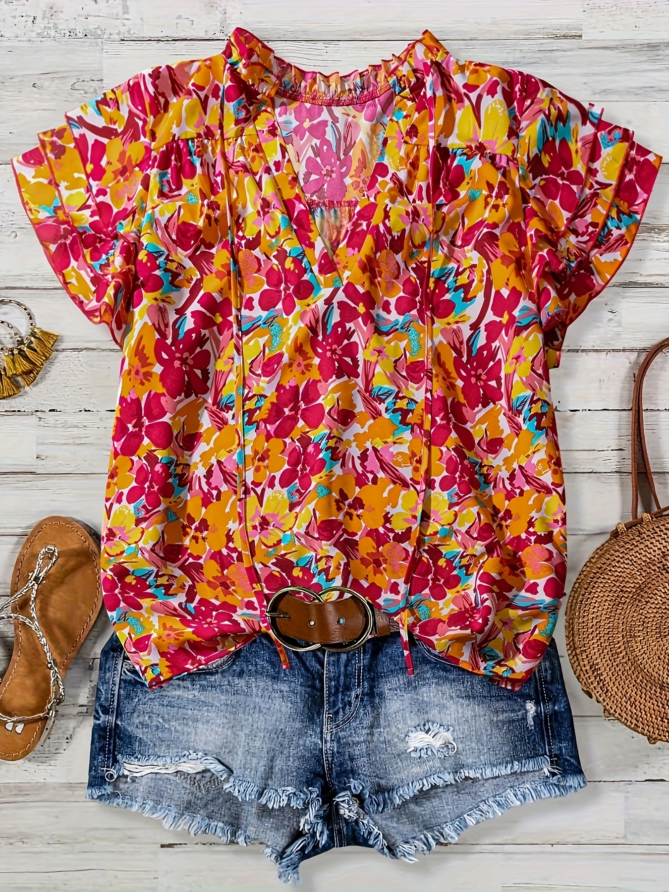 [Vibrant Blouse] Vibrant Floral Plus Size Women's V-Neck Blouse | Elegant Short Sleeve Summer Top, Non-Stretch Fabric, Casual & Stylish For Casual Attire