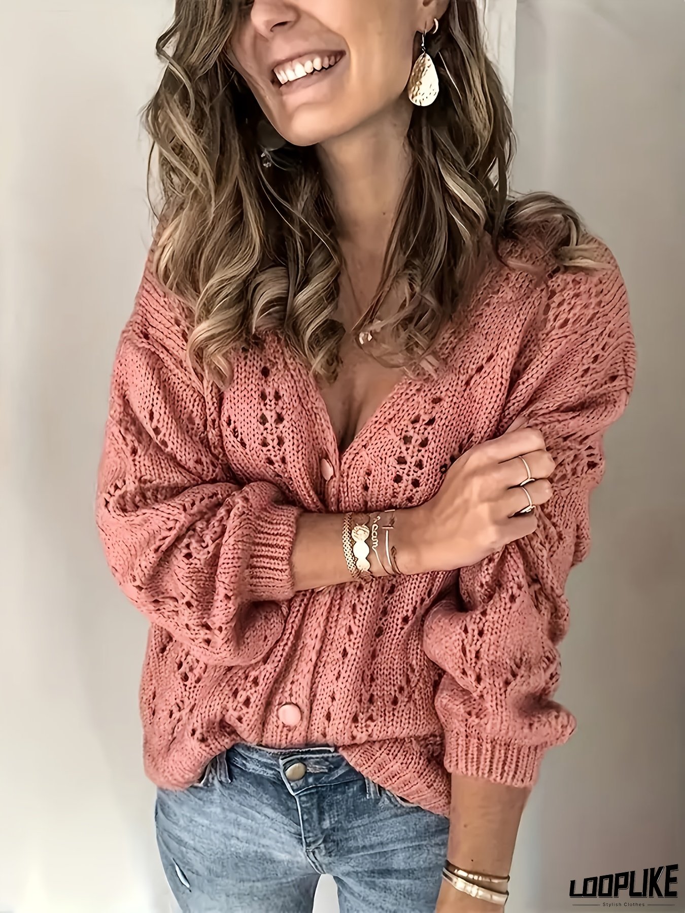 Relaxed cardigan, V-neck Fleece coat, button design, openwork technique, Women's wear