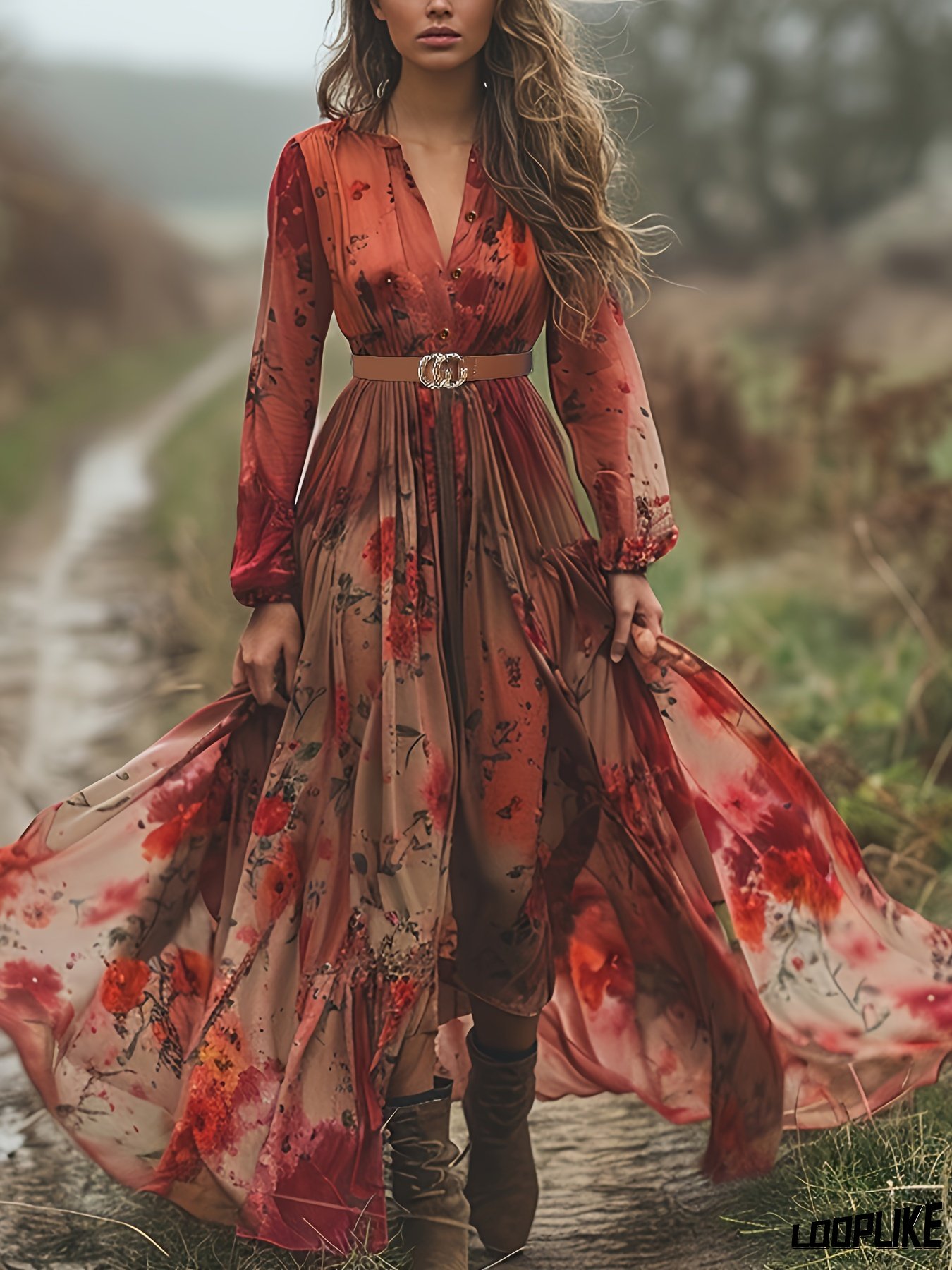 Vintage Floral Print V-Neck Long Sleeve Maxi Dress for Women - Summer Vacation Style with Belt, A-Line Silhouette, and Flowing Hem, Vintage Dress