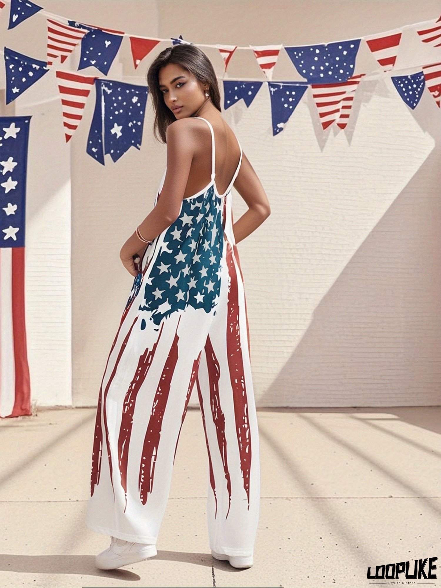 Women'S American Flag Overalls Jumpsuit - Red, White & Blue Fourth of July Outfit, Casual Slingback Pants for Parades, Picnics, BBQs - Lightweight Fourth of July Costume for Women, Festival Wear, Parade Attire, Geometric Pattern, Patriotic Design, Easy Care, Breathable Fabric, Overalls Trousers, Festival Goers, Summer Wardrobe