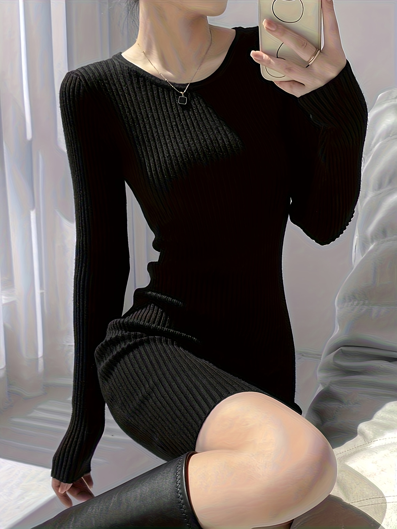 Women's Autumn Winter Tummy Control Bodycon Dress - Soft Ribbed Long Sleeve Round Neck, Medium Stretch Machine Washable Solid Color Elegant Casual to Semi-Formal Dress