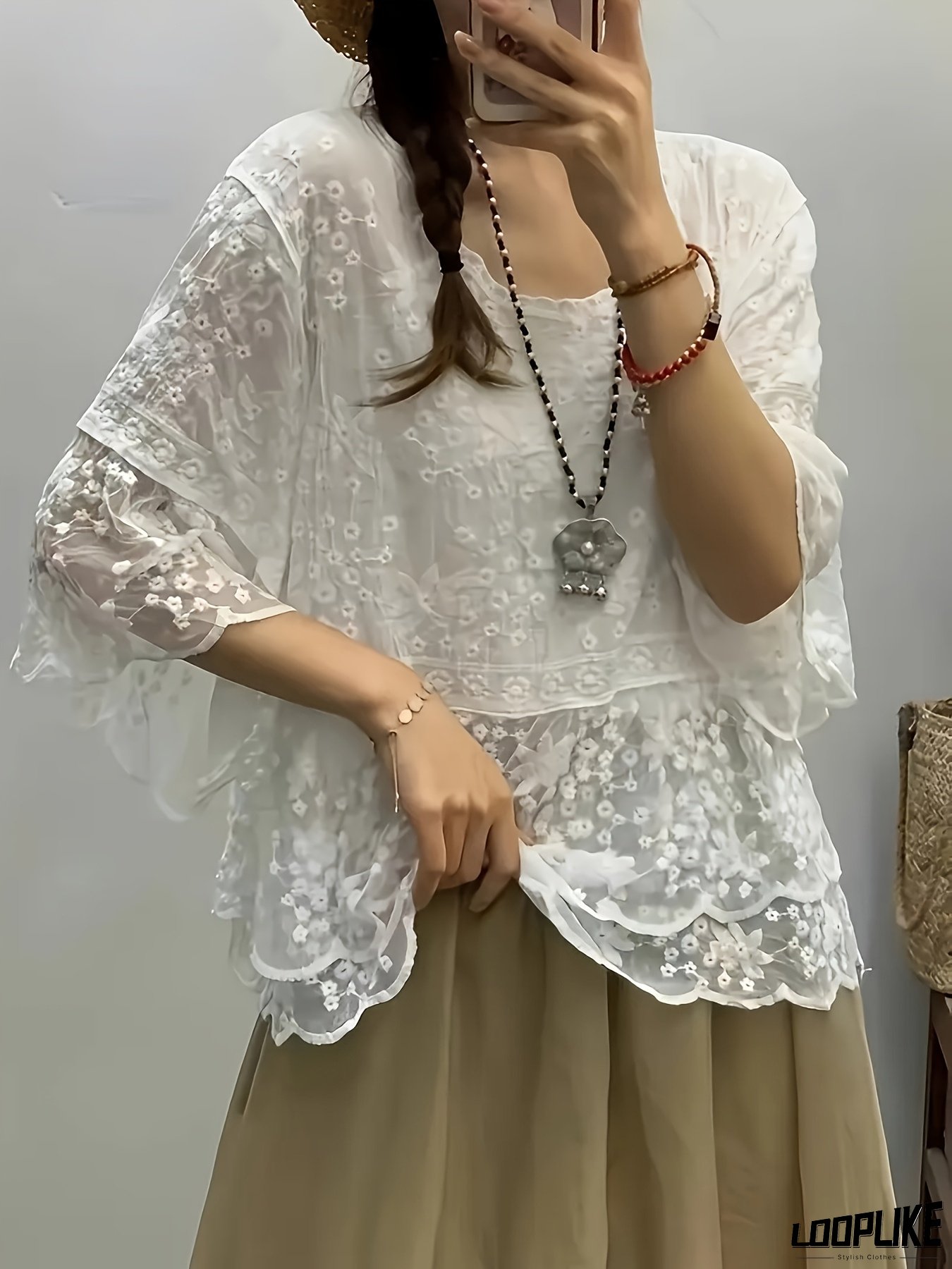 Women's Bohemian Embroidered V-Neck Sun-Protective Top - Lightweight 3/4 Sleeve Lace Overlay Blouse With Breathable Semi-Sheer Fabric For Summer Casual & Beach Outings, Beach Lace Cover Up, Clothing, Floral Embroidery, Elegant Style