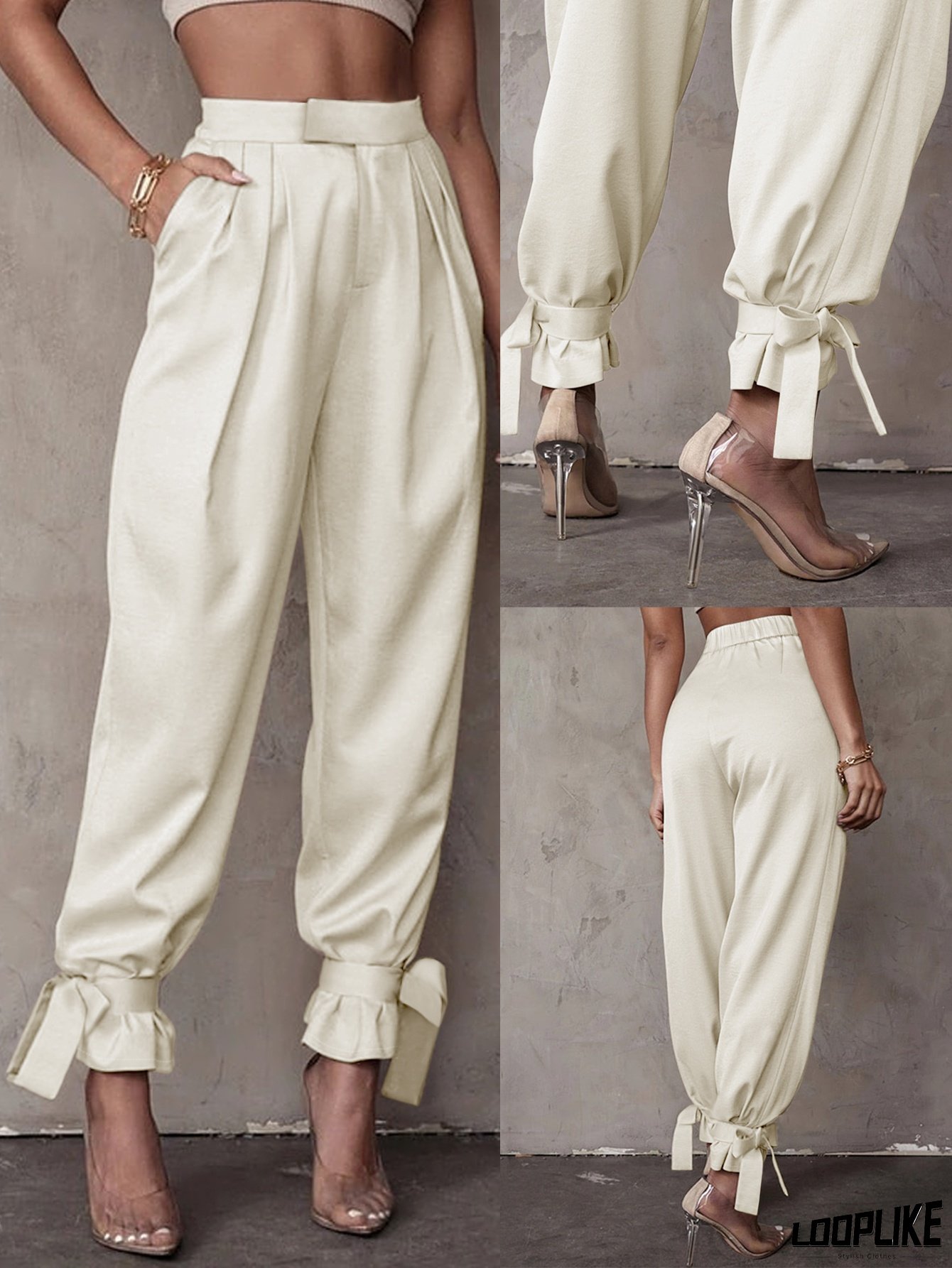 Women'S Casual Loose-Fit Jogger Pants with Tie Waist & Bow Detail - Solid Color Black, Elastic Cuffs & Pockets, All-Season Comfort for Relaxing Wear, Jogging Pants, Relaxed Fit Trousers, Comfortable Footwear