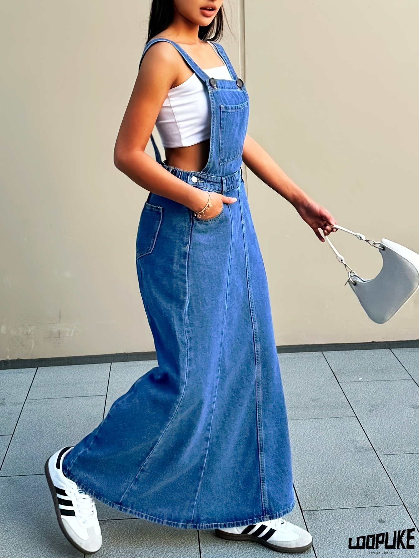 Women'S Denim Dress Vintage Faded Washed, Adjustable Shoulder Straps - Long Loose Fit Long Skirt Dress