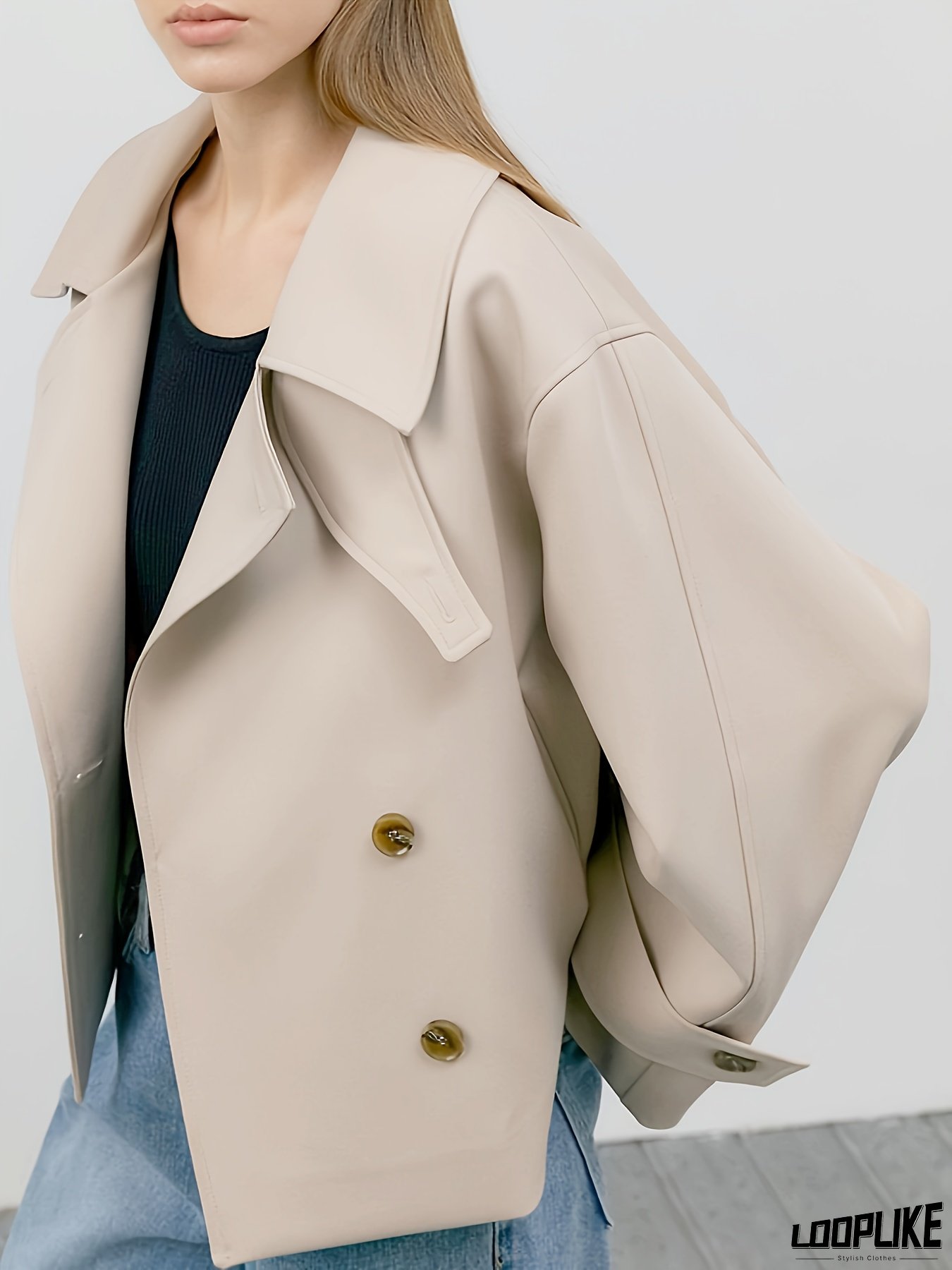 Women'S Elegant Beige Double-Breasted Jacket - Stylish Short Length, Button-Up, Long Sleeve, Perfect for Fall/Winter, Casual to Formal Attire, Casual Attire Jacket|Sleek Jacket|Polyester Jacket
