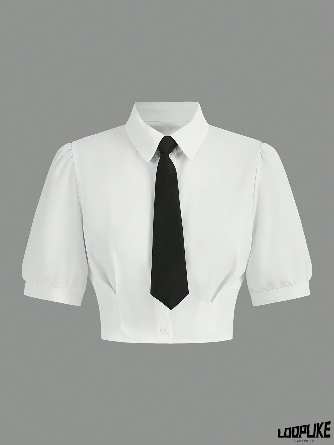 Women's Elegant Classic Collar Mid-Sleeve Shirt with Black Tie Accent - Solid White Button-Up Blouse for Spring Summer Fall, Machine Washable Office & Casual Wear, Seasonal Fashion, Nontransparent Fabric, Structured Design