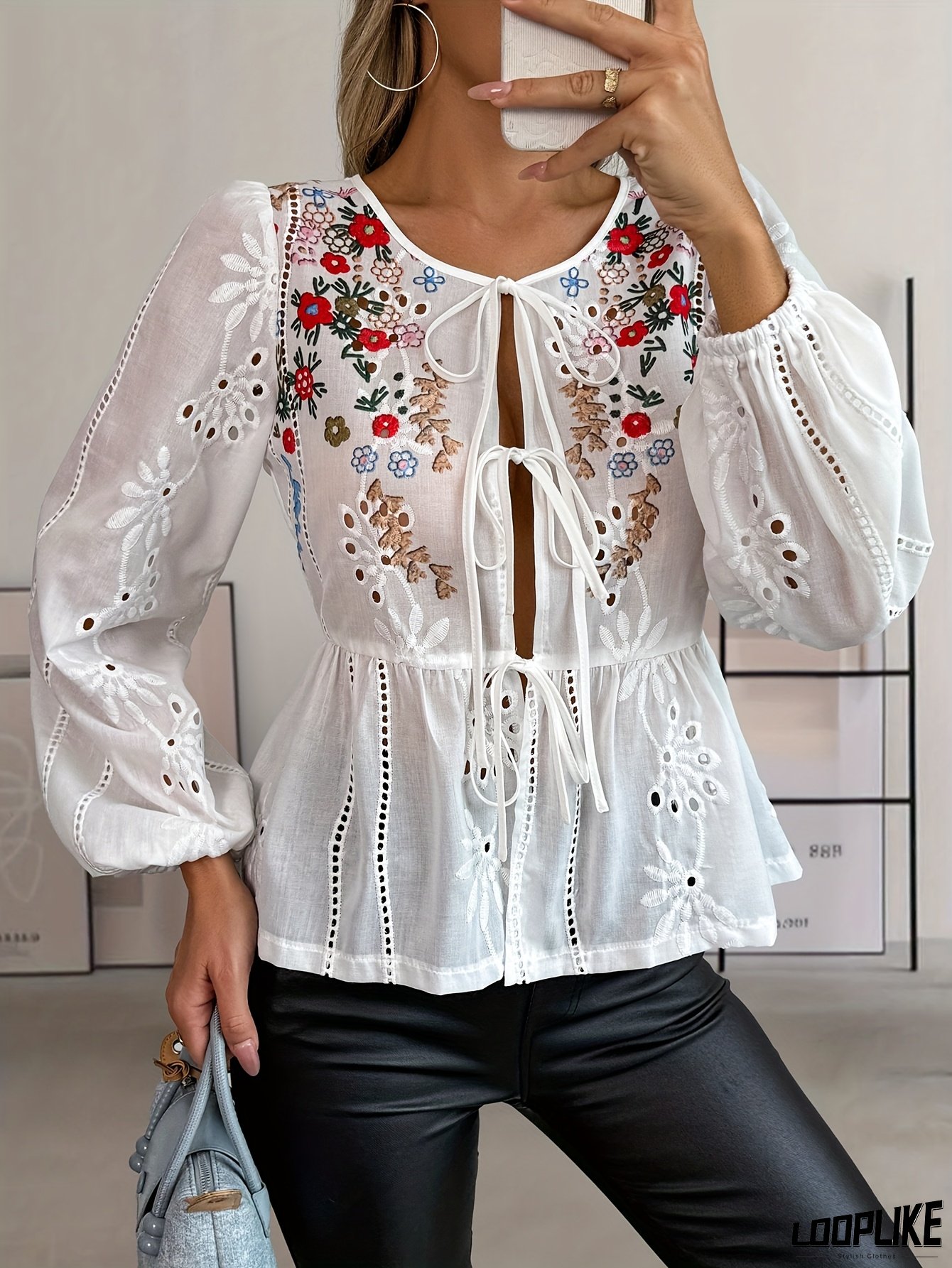 Women's Elegant French-Inspired Lace Embroidered Blouse With Front Tie, Long Sleeves, And Floral Pattern - White, Perfect For Summer, Adult Size, Casual Attire, Casual Summer Wear | Floral Embroidery | Lace Detailing, Ladies Blouses