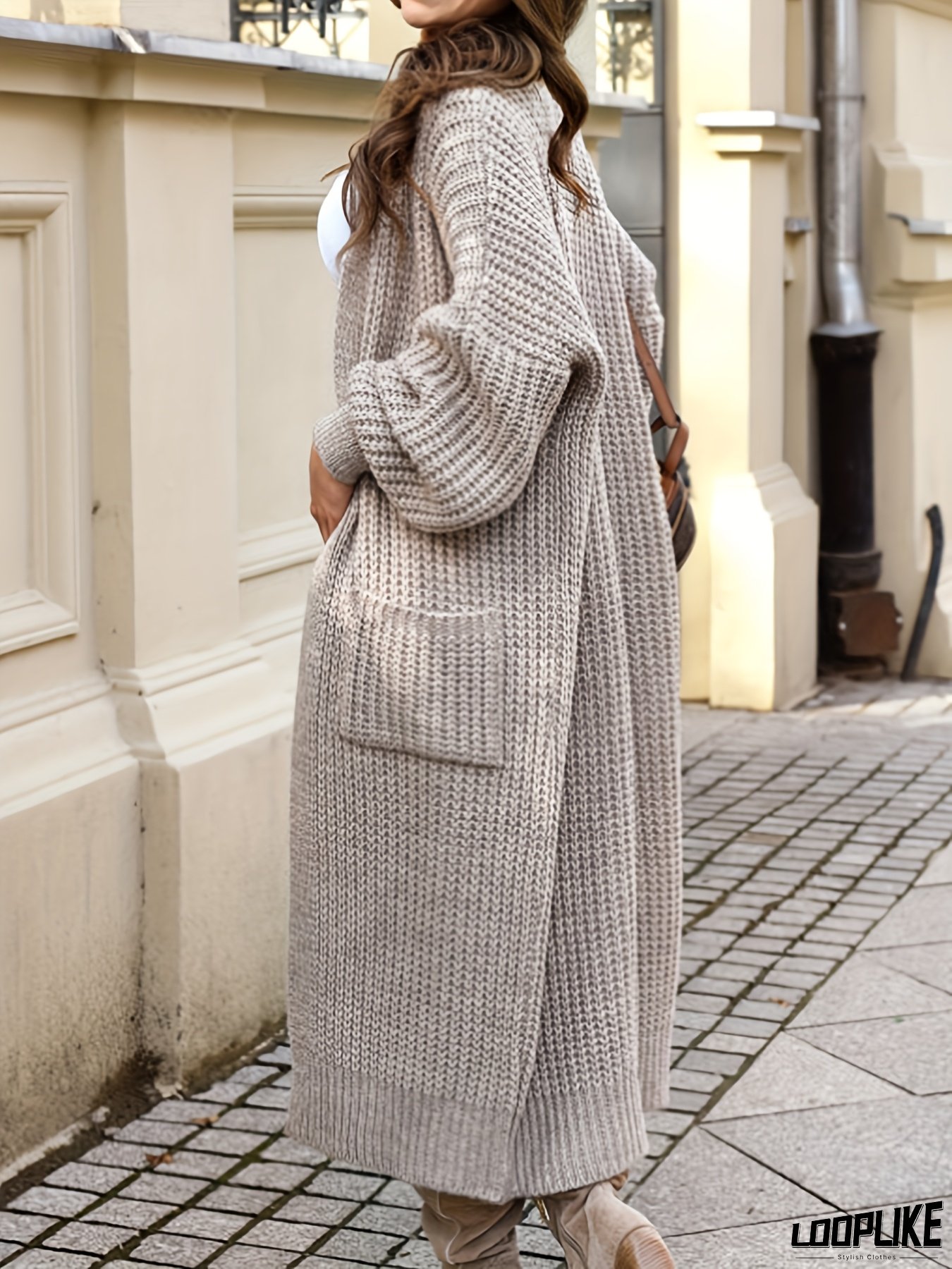 [Elegant Sweater Coat] Elegant Long Sweater Coat for Women | Beige Open Front Sweater Jacket with Side Pockets, Stretchy Outerwear for Fall/Winter, Office, Parties, Everyday Chic - Non-Transparent Formal & Casual Outerwear, Ladies Sweaters, Winter Apparel, Durable Fabric