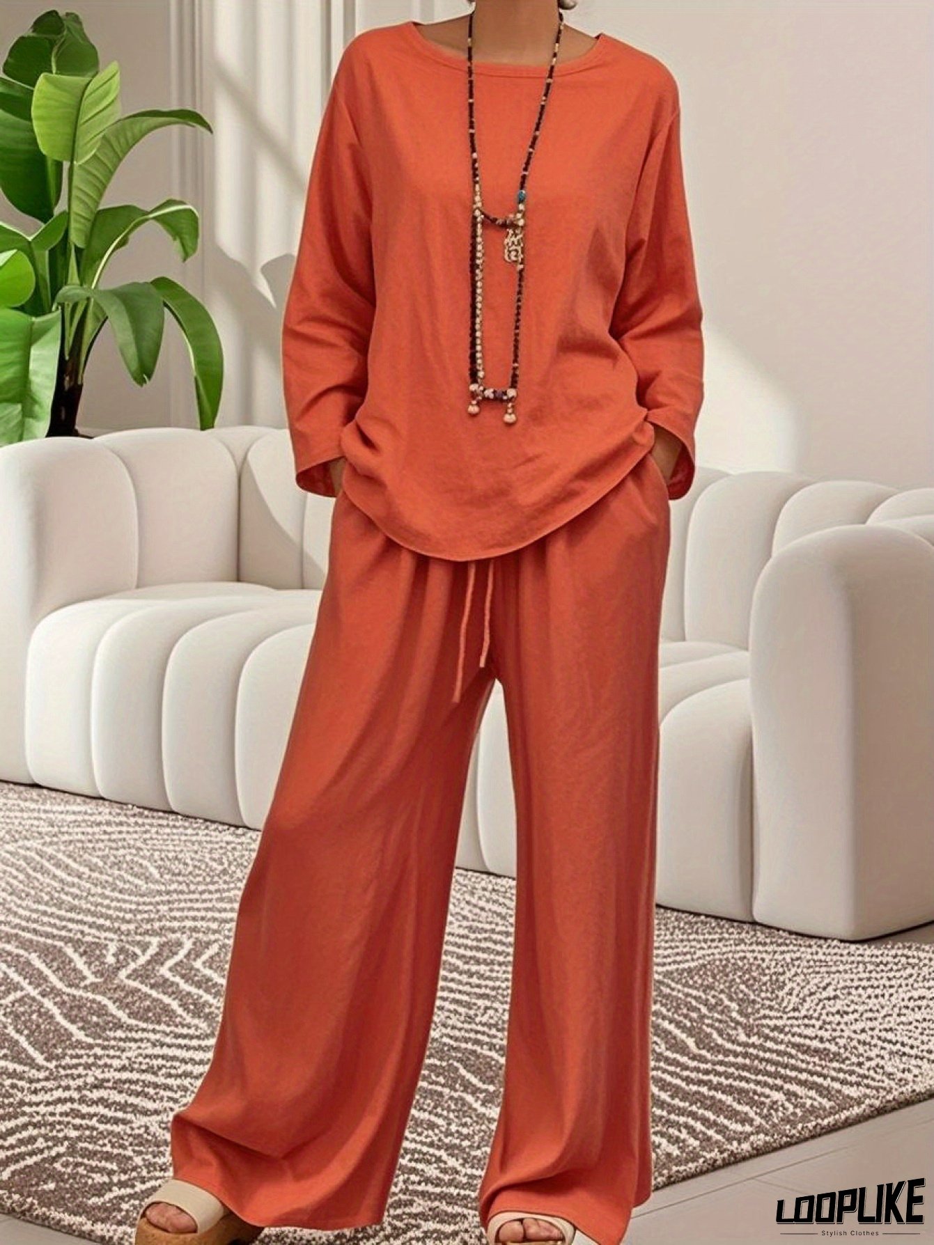 Women'S Elegant Solid Color Long Sleeve Top & Drawstring Pants Set - Cozy Fall/Winter Casual Wear with Pockets, Polyester Blend, Machine Washable, Stylish Jewelry Accessory, Cozy Clothing | Elegant Casual Wear | Polyester Blend