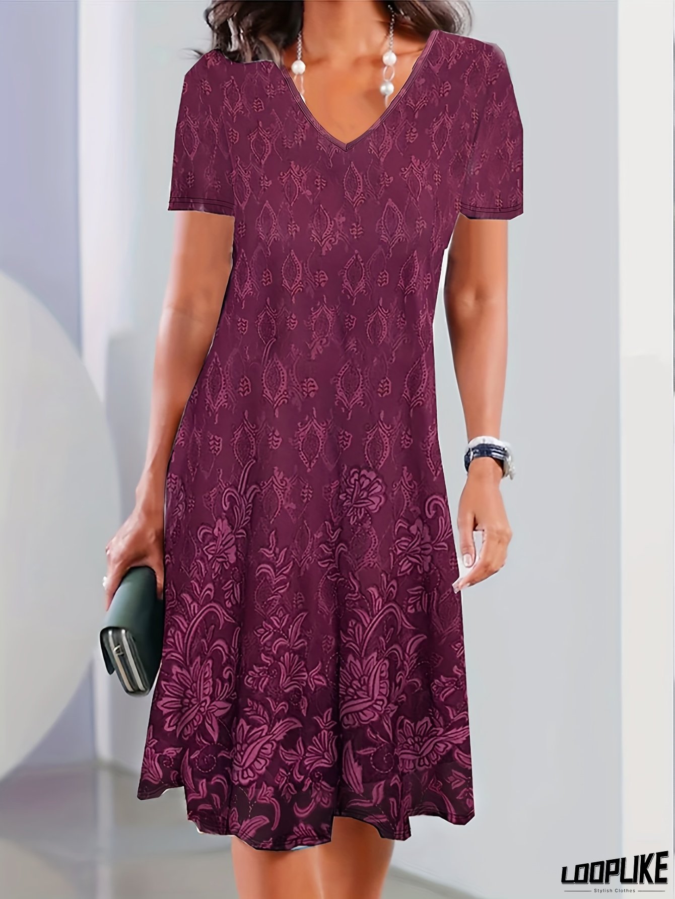 Women's Elegant V-Neck Short Sleeve Dress With Floral Print - Lightweight Polyester, A-Line Silhouette, Perfect For Spring & Summer Getaways, Lightweight Dress | Elegant Vneck Dress | Polyester Fabric