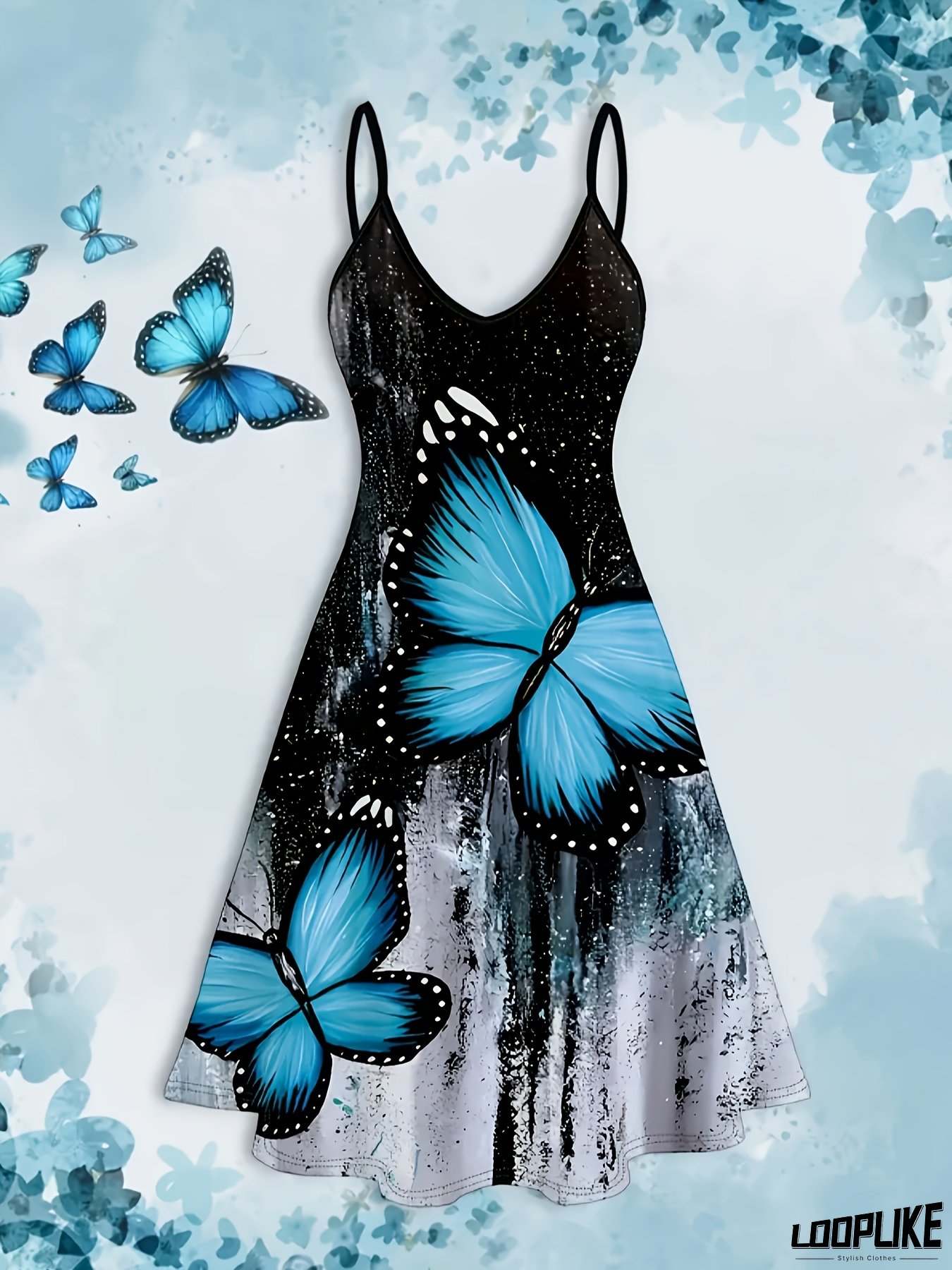 Women's Elegant V-Neck Sleeveless A-Line Midi Dress - High Waist, Gradient Blue Butterfly Print With Floral Accents, Lightweight Polyester, Perfect For Summer, Casual Elegance | Floral Accent Dress | Glossy Texture
