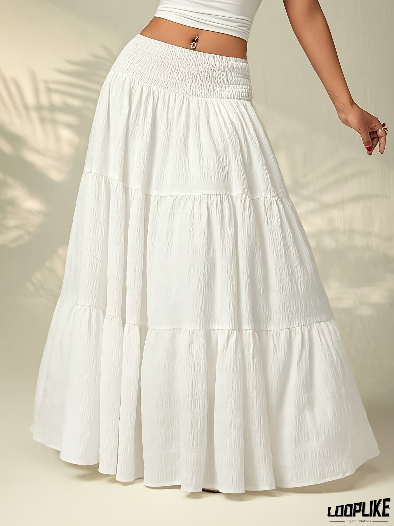 [White Maxi Skirt] High-Waisted Women's Elegant White Pleated Maxi Skirt With Floral Embroidery | Flowy Ruffled Hem, Perfect For Spring & Summer, Casual To Formal Wear