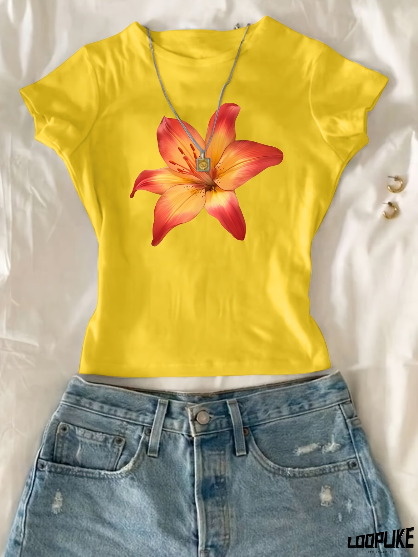 Women'S Floral Print Crop Top T-Shirt - Black with Red Floral Design, Casual Chic Summer Outfits, Non-See-Through Fabric for Everyday & Formal Events, Ladies T Shirts, Event Fashion, Nontransparent Fabric, Party Outfit, Trendy Design, Lightweight Tee, Short Sleeve Tee, Women