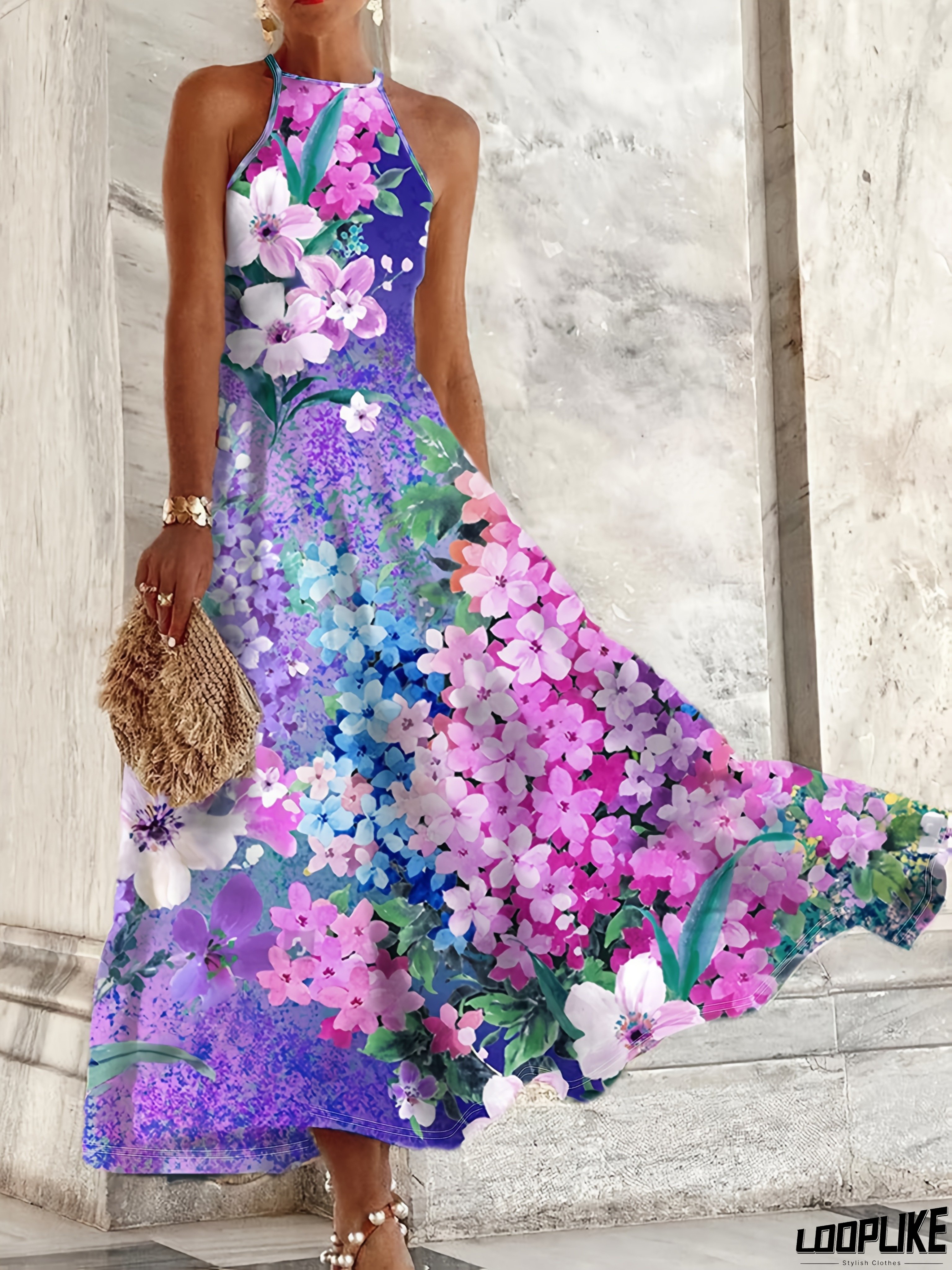 Women'S Floral Print Halter Neck Maxi Dress - Sleeveless, Ruffled Hem, Vibrant Pink & Purple Flowers, Perfect for Outdoor Vacations and Casual Wear, Casual Dressing | Floral Print Dress | Ruffled Hem Dress