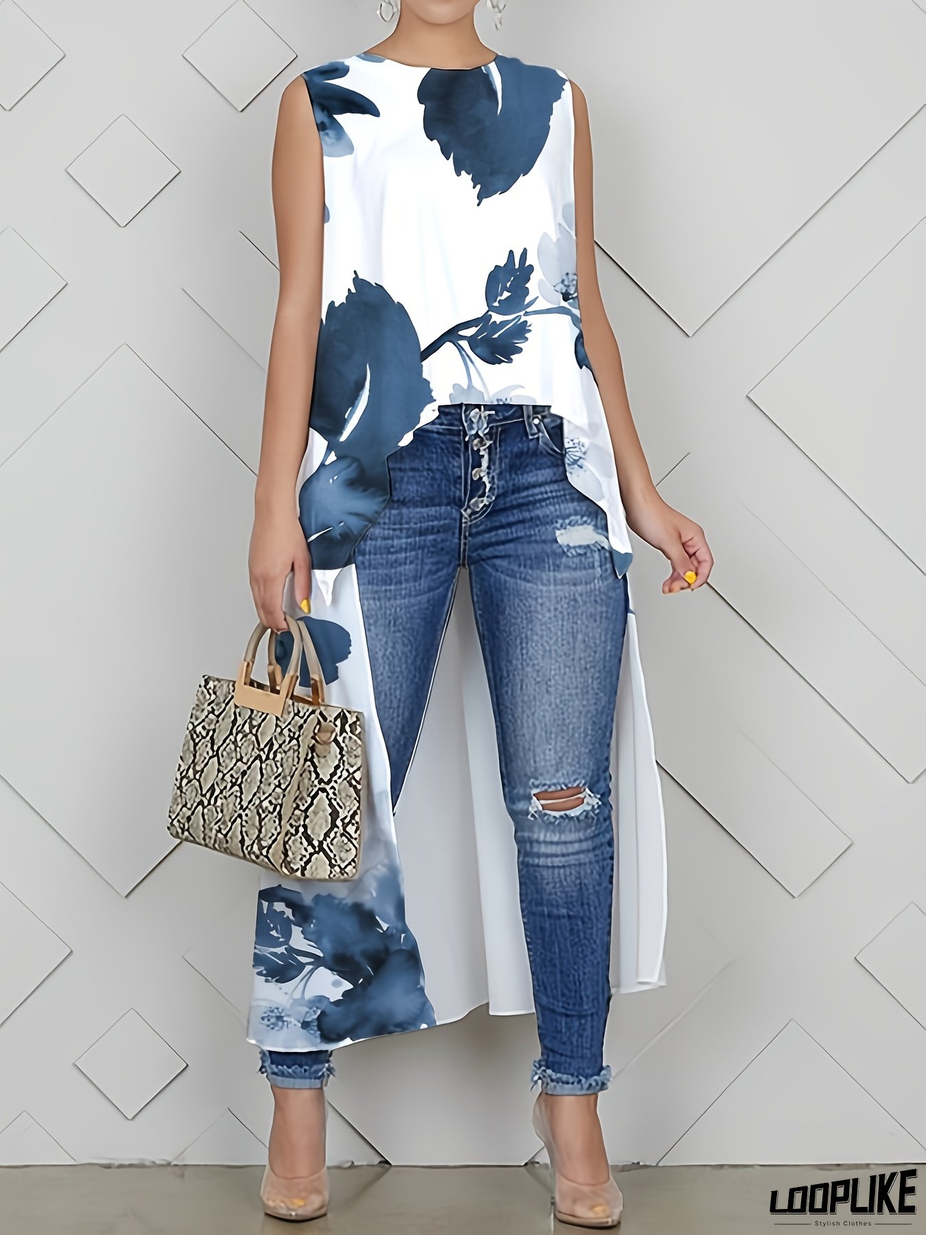 Women's Floral Print Sleeveless Shirt - Asymmetrical Hem Casual Chic Blouse with Round Neck, Semi-Sheer Loose Fit Long Top for All-Season Wear, Versatile Fashion, Stylish Layered Outfits, Feminine Casualwear, Everyday Fashion, Easy Care, Adult Clothing