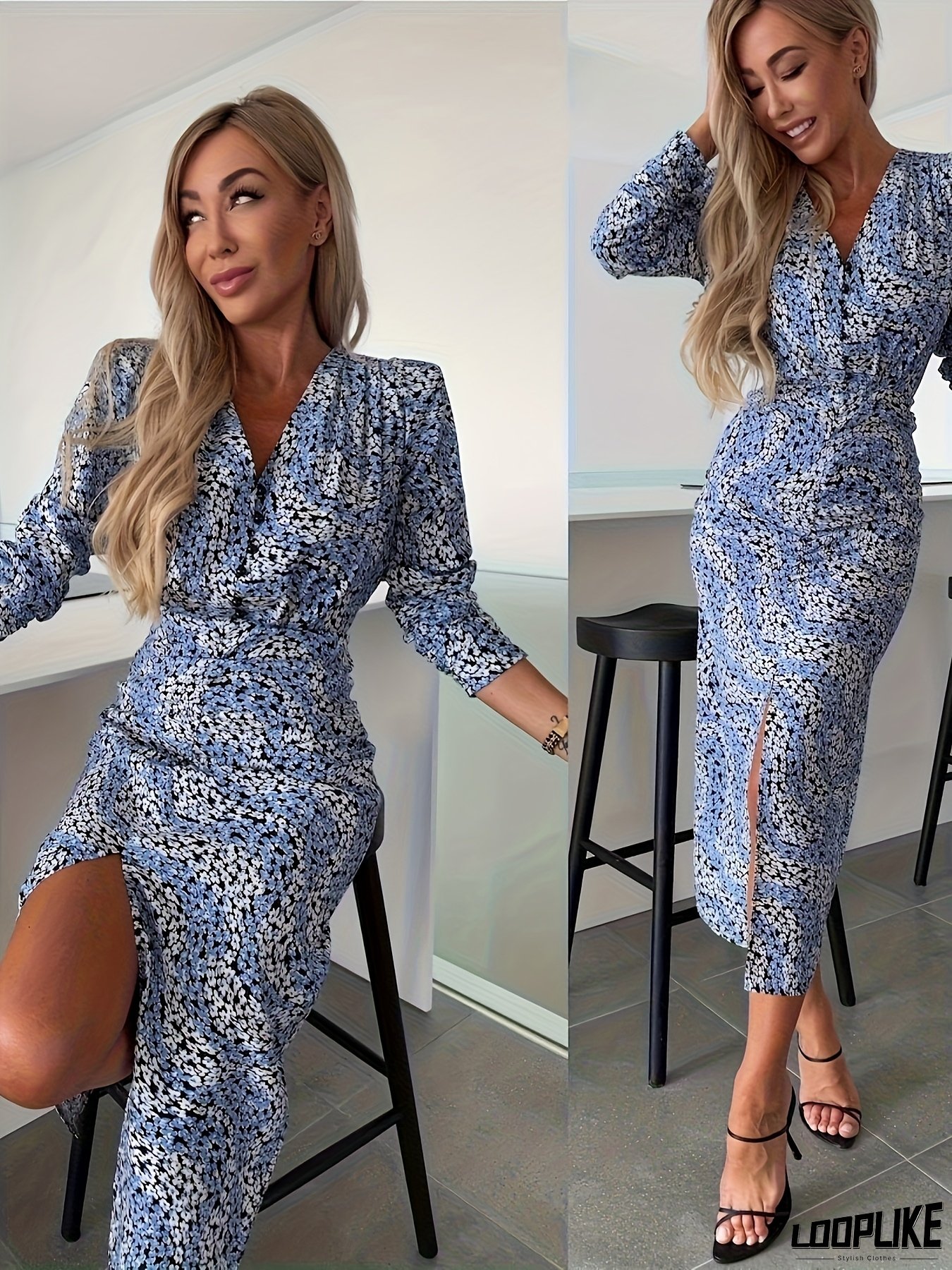 Women's Floral Print V-Neck Dress With Side Slit - Long Sleeve, Knee-Length, Light Blue & White Floral Pattern, Perfect For Spring/Summer, Casual To Formal Wear, Casual Summer Dress | Floral Print Dress | Fabric, Long Sleeve Dress For Women Elegant Classy, Summer Dress For Women, Dress For Women Elegant Classy, Dress For Women Summer, Elegant Dress For Women, Dress For Lady