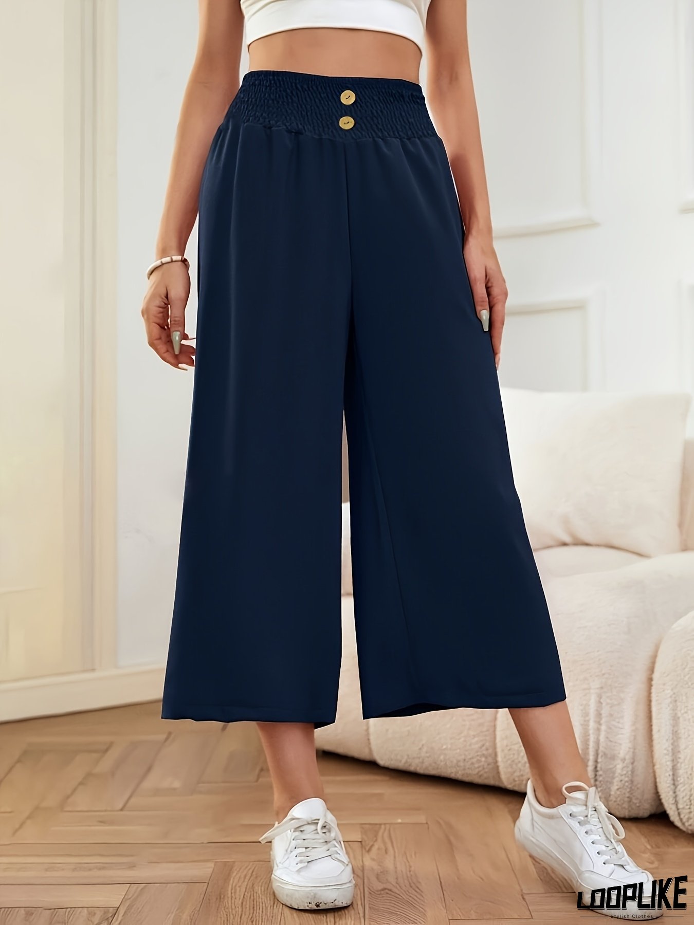 Women'S High-Waist Wide-Leg Pants - Navy Blue, Button Detail, Elastic Waistband, Flowy Design, Perfect for Spring/Summer, Casual Wear, High Waisted Leggings