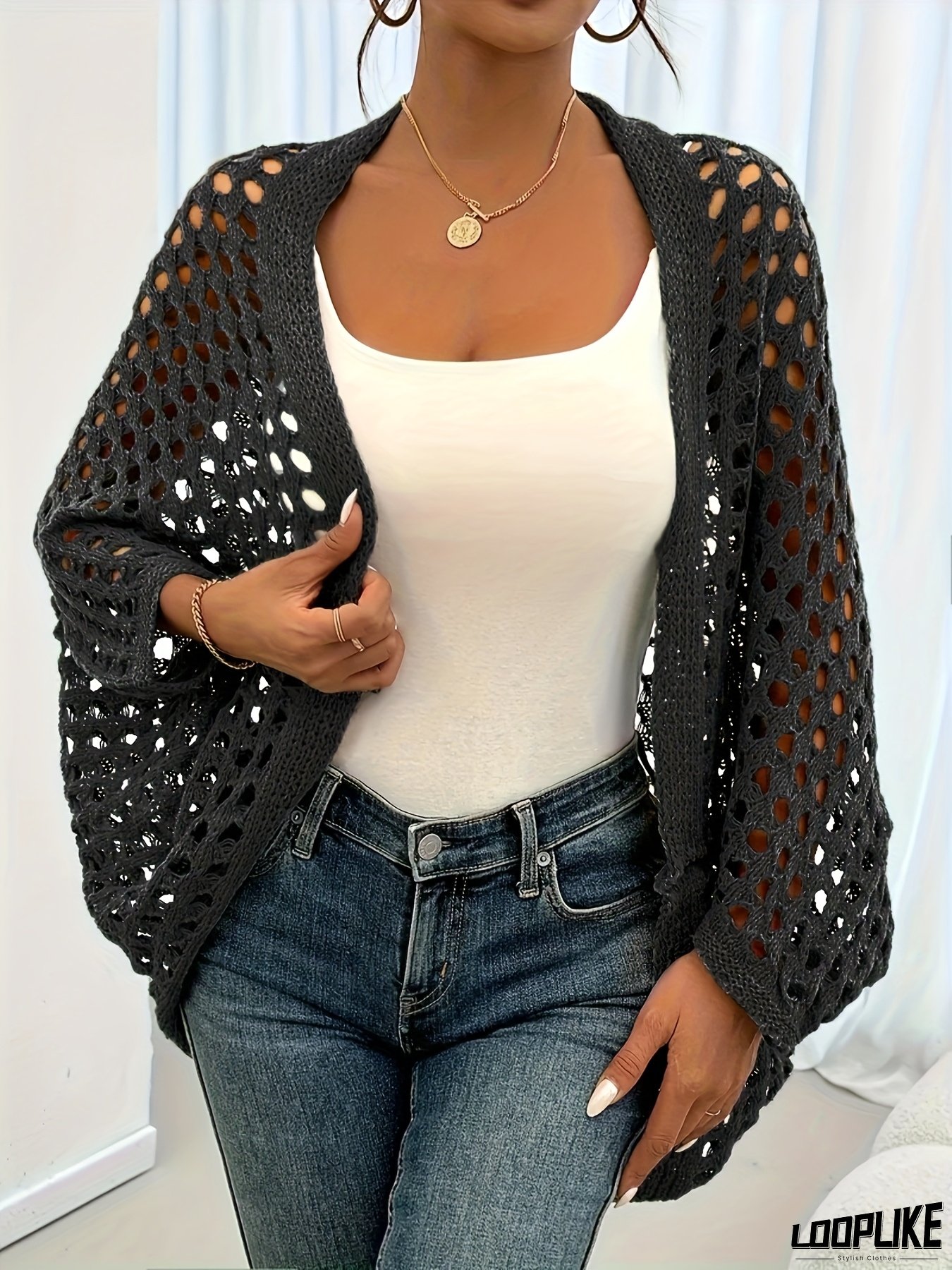 [Lightweight Crochet Cardigan] Lightweight Crochet Cardigan for Women - Casual Loose Fit Short Sleeve with Eyelet Detail, Solid Color, Perfect for Spring & Fall, Versatile Layering Piece | Eyelet Crochet Cardigan | Crochet Texture