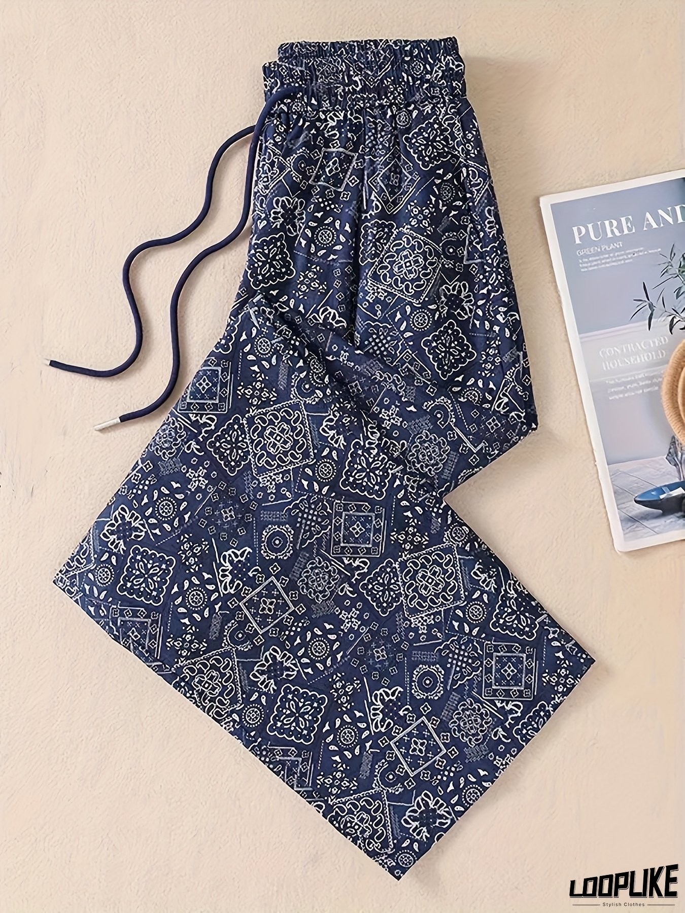 Women's Navy Blue & White Paisley Wide-Leg Pants - Retro-Inspired Geometric Print Trousers with Elastic-Free Comfort, All-Season Machine Washable Fabric for Casual & Formal Outfits (Non-Stretch Durable Design)