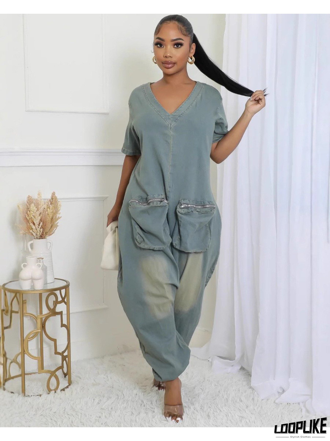 Women's Oversized Washed Denim Jumpsuit - Green/Beige Wide-Leg Romper with Large Chest Pocket, Short Sleeve & Round Neck, Machine Washable Casual to Semi-Formal Wear (Spring Summer Fall) Jeans Costume