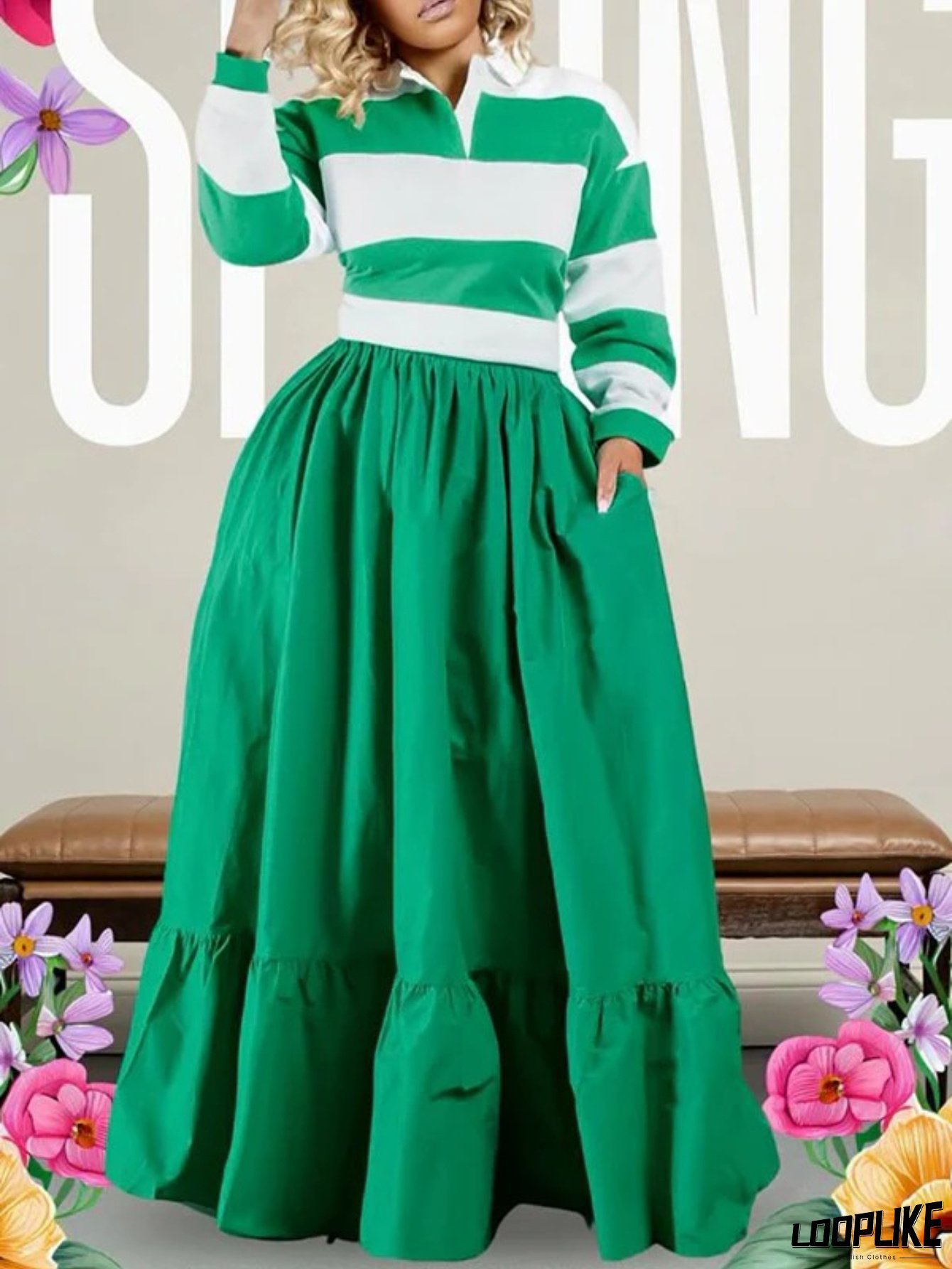 [Fashion Striped Dress] Women's Fashion Striped Ruffle Hem Long Dress | Green And White Stripe Spliced, A-Line Collar, Long Sleeve Maxi Skirt, All-Season Wrap