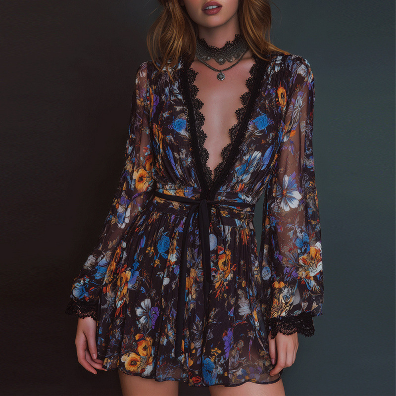 This playful mini dress features a soft mesh base with a vibrant watercolor floral print, a deep V-neck trimmed in delicate black lace, and billowy bishop sleeves with lace cuffs. The self-tie waist belt cinches your figure, creating a flattering silhouette perfect for date nights, bridal showers, or summer parties. It pairs effortlessly with strappy heels and a choker necklace for a romantic, head-turning ensemble.