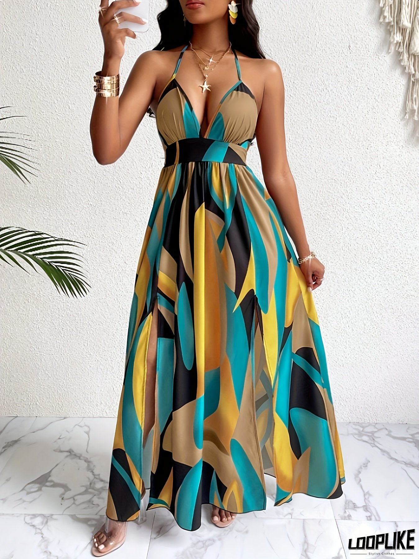 Women's Tropical Print Halter Neck A-Line Dress With Thigh-High Slit - Vibrant Yellow & Teal Color Block, Machine Washable Mid-Length Summer Dress For Beach Vacation & Casual Outings, Beach Dress, Summer Fashion, Flowy Fabric