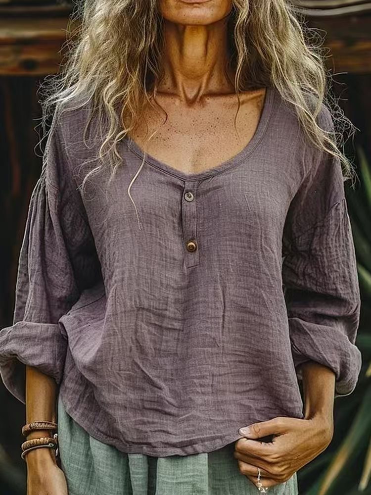 A casual, oversized blouse in a muted green, featuring a V-neckline with a buttoned placket and long sleeves that can be rolled up. The lightweight, crinkled linen-blend fabric and relaxed fit create a laid-back, bohemian style, ideal for layering or wearing alone.