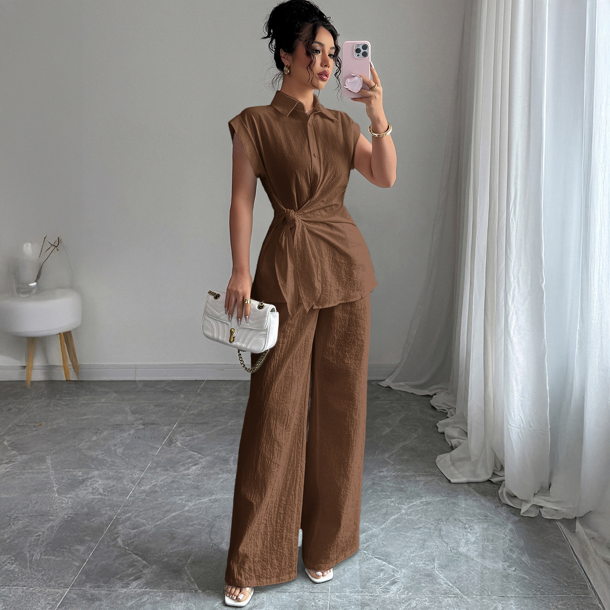A chic two-piece set in crisp white, including a cap-sleeve button-down shirt with a self-tie waist detail, paired with high-waisted wide-leg pants. The lightweight, textured fabric and relaxed fit create a polished, effortless look ideal for office wear, brunch, or warm-weather outings.