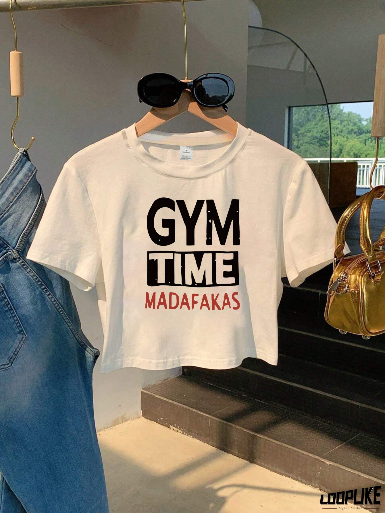 Y2K Retro "GYM TIME" Graphic Cropped Sweatshirt - Slim Fit Short Sleeve Crew Neck Top with Geometric Print, Breathable Polyester for Women's Spring & Summer Casual Wear, Gym Shirt